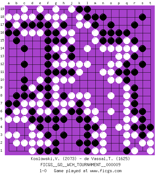 Last move : 1-0 2013 October 20 23:49:41 [Event "FICGS__GO__WCH_TOURNAMENT__000009"] [Site "FICGS"] [Date "2012.11.01"] [Round "1"] [Black "Koslowski,Volker"] [White "de Vassal,Thibault"] [Result "1-0"] [Rating 1 "2073"] [Rating 2 "1625"] 1.q16 d4 2.r4 d16 3.f3 c6 4.l3 p4 5.r6 n4 6.l5 r3 7.c12 f4 8.g4 e3 9.f5 f2 10.e4 e2 11.d5 c5 12.c4 d3 13.g2 q3 14.r11 k17 15.c14 c16 16.j14 g17 17.f14 o6 18.d6 c7 19.h17 h18 20.g18 f18 21.g16 g19 22.f17 g18 23.r9 d7 24.f16 n17 25.o16 o8 26.n16 o10 27.m17 o12 28.e17 d18 29.d17 c18 30.c3 c2 31.e18 e19 32.c17 b17 33.d19 c19 34.b16 b18 35.b15 h16 36.h15 j16 37.f7 l8 38.r13 q7 39.r7 l12 40.c10 j12 41.h11 j10 42.s3 s2 43.j11 k11 44.k6 j7 45.k7 k8 46.o17 h12 47.f12 h10 48.g11 m3 49.m2 n2 50.j6 h7 51.m4 n3 52.k2 d9 53.f1 b3 54.r17 o14 55.e1 d2 56.s5 q13 57.q14 p14 58.q12 p13 59.l18 k18 60.r2 t3 61.s4 r1 62.c9 e10 63.f9 m6 64.d8 e8 65.c8 e7 66.e9 g10 67.f10 g12 68.f11 g14 69.g13 q15 70.r15 r14 71.s14 q14 72.s12 h13 73.f13 h14 74.g15 l14 75.j13 k12 76.g6 q8 77.r8 j15 78.t2 t1 79.q1 q2 80.b7 b6 81.b8 m1 82.l2 h6 83.h5 e6 84.e5 l17 85.m18 e16 86.f15 m15 87.h8 j8 88.p11 g8 89.o11 n11 90.b4 b5 91.a4 b2 92.f8 p10 93.q10 p12 94.l1 n1 95.k19 j19 96.l19 m16 97.n18 m5 98.l4 q11 99.p11 q6 100.a17 a18 101.a16 q9 102.a6 a3 103.p16 o11 104.q11 g7 105.h3 a5 106.a7 f6 107.g5 d1 108.g1 q5 109.t4 r5 110.s6 t2 111.n15 n14 112.o15 l7 113.s18 l6 114.k5 q4 115.p15 g9 116.pass 1-0 Here are the names of the openings (joseki) played in the four corners : Corner d4 : d4 f3 Hoshi (Hwajeom, Seongjeom, Xingwei`) 4-4 Point. The star or hoshi (4-4) point, emphasizing influence at the potential expense of territory. Ikken Kakari (Hankan Keolch'im, Yi Gua`jiao~, 1-Space Low Approach). Black 2 is the standard approach move to the 4-4. Corner d16 : d16 c12 Hoshi (Hwajeom, Seongjeom, Xingwei`) 4-4 Point. The star or hoshi (4-4) point, emphasizing influence at the potential expense of territory. Player Black won this Go (weiqi, baduk) game. Follow this game move after move (download)The L-group is dead. (Anonymous) Logic : The art of thinking and reasoning in strict accordance with the limitations and incapacities of the human misunderstanding. (Ambrose Bierce)