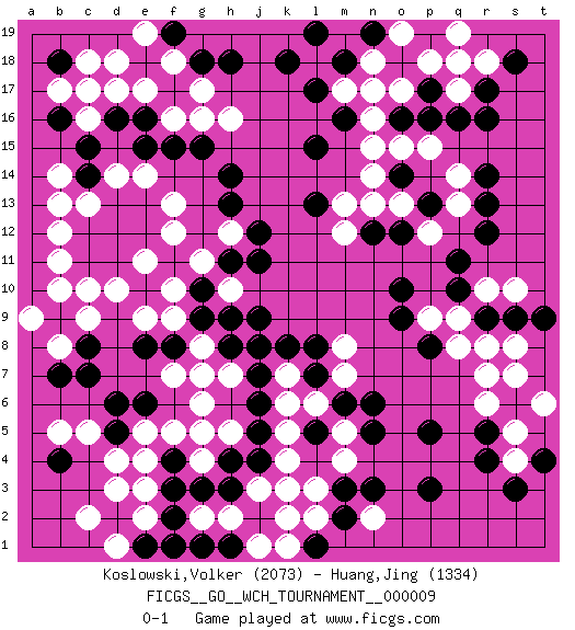 Last move : 0-1 2013 September 18 9:13:28 [Event "FICGS__GO__WCH_TOURNAMENT__000009"] [Site "FICGS"] [Date "2012.11.01"] [Round "1"] [Black "Koslowski,Volker"] [White "Huang,Jing"] [Result "0-1"] [Rating 1 "2073"] [Rating 2 "1334"] 1.q16 d4 2.r4 d17 3.p3 r10 4.c15 d12 5.e16 e17 6.d16 f16 7.c17 c18 8.f15 g16 9.g15 h16 10.h14 c9 11.r12 r7 12.g3 e3 13.g5 l3 14.g7 j3 15.g10 k6 16.k8 o17 17.c7 c5 18.d6 c13 19.c11 d10 20.q10 q9 21.q11 p9 22.l17 q17 23.r17 r18 24.d11 e11 25.p17 q18 26.e12 b11 27.c12 b12 28.d13 c10 29.d12 b14 30.p16 p18 31.r16 n17 32.o10 n15 33.n3 g2 34.c14 b13 35.l15 n13 36.o14 n14 37.f17 f18 38.l13 s4 39.r5 s5 40.e18 d18 41.s3 r6 42.s18 l18 43.e10 e9 44.h3 h2 45.j4 k3 46.l5 l6 47.m18 m17 48.m16 o15 49.k18 n18 50.r9 s10 51.l19 q14 52.p13 p15 53.r14 q13 54.r13 p12 55.o12 o13 56.g18 g17 57.b9 b8 58.c8 b10 59.b7 a9 60.o9 f10 61.p8 q8 62.n19 o19 63.f8 g11 64.s9 s8 65.h11 h10 66.g9 h12 67.j11 f12 68.p5 m5 69.h18 m8 70.b18 b17 71.b16 c16 72.f2 c17 73.f3 e2 74.e1 d1 75.f1 c2 76.d2 d3 77.m6 k5 78.n5 m4 79.l7 k4 80.m2 l2 81.l1 k1 82.j2 j1 83.g1 k2 84.h1 h5 85.h4 m7 86.n6 j8 87.j7 k7 88.l8 h7 89.j9 g6 90.h8 f5 91.j5 g4 92.j6 e14 93.e15 d14 94.j12 m12 95.h13 f7 96.e8 g8 97.j8 f9 98.g7 n2 99.m3 g8 100.h9 g7 101.t9 r8 102.s6 t6 103.e13 f13 104.t4 s7 105.f4 e5 106.f19 e19 107.d5 e4 108.b4 b5 109.o16 n16 110.n12 m13 111.e6 g5 112.p19 q19 0-1 Here are the names of the openings (joseki) played in the four corners : Corner d16 : d17 c15 Komoku (Somok, Xiao~mu`) 3-4 Point. The komoku (3-4) point is the traditional corner enclosure move.. Ikken Kakari (Hankan Keolch'im, Yi Gua`jiao~, 1-Space Low Pincer). The small knight move is the basic approach move to the 3-4 point stone. It has been continually used for over four centuries. There are limitless variations, with new moves constantly being discovered. Black 2 opens the door to a treaure store of joseki. Player White won this Go (weiqi, baduk) game. Follow this game move after move (download)In opponents' sphere of influence, avoid sharp conflict, don't move too deep. (Otake Hideo, 9p) A good aphorism is too hard for the tooth of time, and is not worn away with the centuries, although it serves as food for every speech. (Friedrich Nietzsche)