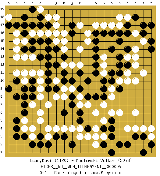 Last move : 0-1 2013 August 31 15:14:1 [Event "FICGS__GO__WCH_TOURNAMENT__000009"] [Site "FICGS"] [Date "2012.11.01"] [Round "1"] [Black "Usan,Kavi"] [White "Koslowski,Volker"] [Result "0-1"] [Rating 1 "1120"] [Rating 2 "2073"] 1.q16 q4 2.c16 d4 3.j17 d13 4.e15 k10 5.d10 c8 6.d8 d7 7.c9 e8 8.d9 g10 9.e7 f7 10.c7 e6 11.c6 r10 12.o3 k3 13.q2 r14 14.o16 m3 15.o5 p6 16.r3 r4 17.s3 n13 18.c3 o6 19.l4 o2 20.p2 n5 21.n4 m4 22.n2 l3 23.e2 g13 24.g3 m17 25.m16 l16 26.m15 n17 27.n16 k17 28.j16 l15 29.m14 k14 30.m13 p17 31.q17 o17 32.p16 n12 33.m12 n11 34.p13 p14 35.o14 r12 36.q14 g17 37.g16 f16 38.f15 g15 39.g14 h15 40.f13 e16 41.d15 q13 42.p15 h14 43.f14 c17 44.d17 d16 45.f17 h16 46.e17 g16 47.c18 c15 48.b17 f3 49.f2 g4 50.h3 n3 51.o4 h4 52.m11 m10 53.q12 r13 54.p11 q11 55.p12 d3 56.d2 m2 57.o1 p10 58.l10 l9 59.n10 m9 60.o10 b16 61.c17 o9 62.p9 q10 63.n9 o8 64.n8 n7 65.o11 c4 66.b3 b14 67.c14 b15 68.d14 c13 69.f12 e11 70.g12 h12 71.h13 j12 72.f11 e10 73.f10 e9 74.g9 f18 75.e18 d11 76.h10 b9 77.b8 c10 78.c8 h8 79.h11 k12 80.e13 b11 81.b4 r6 82.m8 g18 83.l8 m6 84.k9 s15 85.k6 g8 86.k5 e19 87.d19 s4 88.s16 t3 89.t2 t4 90.s1 q18 91.r18 t16 92.t17 r16 93.s17 b13 94.t15 p18 95.t14 s11 96.h6 e5 97.j2 c5 98.b5 k7 99.j7 l7 100.j8 h9 101.f9 a18 102.a17 j9 103.j10 k8 104.k11 k4 105.a9 j4 106.b10 c11 107.e3 f4 0-1 Here are the names of the openings (joseki) played in the four corners : Corner q4 : q4 o3 Hoshi (Hwajeom, Seongjeom, Xingwei`) 4-4 Point. The star or hoshi (4-4) point, emphasizing influence at the potential expense of territory. Ikken Kakari (Hankan Keolch'im, Yi Gua`jiao~, 1-Space Low Approach). Black 2 is the standard approach move to the 4-4. Corner q16 : q16 r14 Hoshi (Hwajeom, Seongjeom, Xingwei`) 4-4 Point. The star or hoshi (4-4) point, emphasizing influence at the potential expense of territory. Ikken Kakari (Hankan Keolch'im, Yi Gua`jiao~, 1-Space Low Approach). White 2 is the standard approach move to the 4-4. Player White won this Go (weiqi, baduk) game. Follow this game move after move (download)Conservative and slow will win. Believe it ! (Anonymous) Plans are ideas that never come to fruition. (Daniel Parmet)