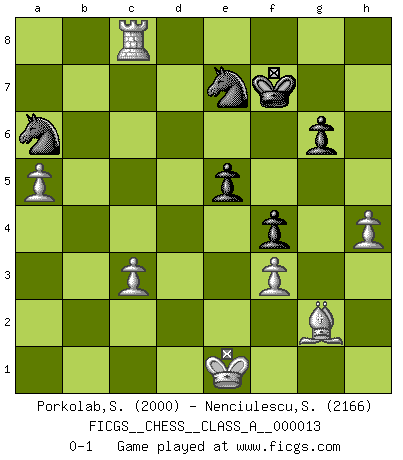 Last move : 0-1 2008 March 17 4:26:7 [Event "FICGS__CHESS__CLASS_A__000013"] [Site "FICGS"] [Date "2007.01.18"] [Round "1"] [White "Porkolab,Sandor"] [Black "Nenciulescu,Silviu"] [Result "0-1"] [WhiteElo "2000"] [BlackElo "2166"] 1.e4 c5 2.Nf3 d6 3.d4 cxd4 4.Nxd4 Nf6 5.Nc3 a6 6.f3 e5 7.Nb3 Be6 8.Be3 Be7 9.Qd2 O-O 10.O-O-O Nbd7 11.g4 b5 12.g5 Nh5 13.Nd5 Bxd5 14.exd5 f5 15.Rg1 f4 16.Bf2 Bxg5 17.Bh3 Be7 18.Na5 Qe8 19.Nc6 Nb8 20.Nxe5 dxe5 21.d6 Nf6 22.dxe7 Qxe7 23.Qd6 Re8 24.Qxe7 Rxe7 25.Rd8+ Kf7 26.Rc8 g6 27.Rd1 a5 28.R1d8 Re8 29.Rxe8 Nxe8 30.Bc5 Na6 31.Rxa8 Nxc5 32.Rxa5 Nd6 33.Ra7+ Kf6 34.Rxh7 Nf7 35.Bg2 b4 36.Kd2 Ne6 37.c3 bxc3+ 38.bxc3 Neg5 39.Rh4 Nd6 40.Kd3 Nf5 41.Rh8 Ne3 42.Bh1 Ne6 43.Rc8 Ke7 44.Rg8 Nc5+ 45.Kd2 Kf6 46.Rc8 Na4 47.h4 Nb2 48.Rb8 Na4 49.Ra8 Nc5 50.Rc8 Nb7 51.a4 Ke6 52.Rg8 Kf6 53.Ke1 Kf7 54.Ra8 Nc5 55.a5 Nd5 56.Rc8 Na6 57.Bg2 Ne7 0-1 This chess game has been lost on time (started : 2007.01.18 8:25:49) Sicilian : Najdorf Kingside Castling by player Black (move 9) Queenside Castling by player White (move 10) Player Black won this chess game. Follow this game move after move (download)Pawns are born free, yet they are everywhere in chains. (Rick Kennedy) Im Schach gibt es keinen Platz für Galanterie. (Irving Chernev) Nunca nadie ha ganado una partida de Ajedrez rindiendose. (Unknown) J'ai vu le vaincu d'Echecs jouer des années durant dans l'espoir de la fête de la victoire. Car tu es plus riche de ce qu'elle existe si même elle n'est point pour toi. Ainsi de la perle du fond des mers. (Antoine de Saint-Exupéry) There is a computer disease that anybody who works with computers knows about. It's a very serious disease and it interferes completely with the work. The trouble with computers is that you 'play' with them ! (Richard P. Feynman)
