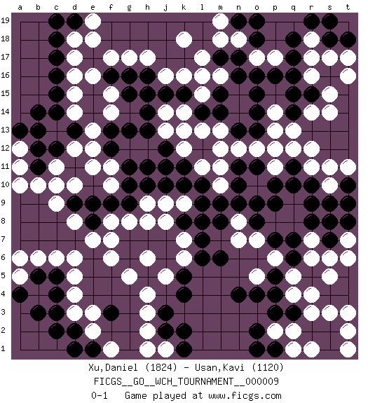 Last move : 0-1 2013 January 4 8:40:4 [Event "FICGS__GO__WCH_TOURNAMENT__000009"] [Site "FICGS"] [Date "2012.11.01"] [Round "1"] [Black "Xu,Daniel"] [White "Usan,Kavi"] [Result "0-1"] [Rating 1 "1824"] [Rating 2 "1120"] 1.q16 d4 2.q3 d16 3.r9 d10 4.k4 k16 5.f3 d6 6.c14 d14 7.c17 d17 8.c16 d15 9.c15 o17 10.q14 q5 11.o4 o5 12.n4 r3 13.r2 r4 14.s2 r7 15.j15 j16 16.g15 g17 17.h13 r12 18.p9 s14 19.r15 s15 20.s16 p12 21.p7 p6 22.q7 r6 23.r8 o7 24.o8 n8 25.n9 n7 26.o13 o12 27.n13 n12 28.m17 m18 29.n17 n18 30.o16 p17 31.p16 l17 32.l9 m13 33.m14 l13 34.l14 m10 35.m9 o10 36.o9 s10 37.s9 r17 38.q17 r16 39.q18 m16 40.n16 r18 41.o18 k14 42.k15 l15 43.m15 l16 44.k13 j14 45.h15 j13 46.j12 k12 47.h14 k13 48.j11 h12 49.k11 m12 50.g11 g12 51.f12 p13 52.o14 p14 53.o15 h3 54.j3 h4 55.c3 d3 56.d2 e2 57.c2 e3 58.b5 b6 59.c5 c6 60.c4 d5 61.c12 c11 62.b11 b10 63.d11 c10 64.f9 f7 65.g7 f6 66.g6 g5 67.j6 d12 68.b12 e11 69.c18 d18 70.j2 h2 71.m6 s3 72.p4 s5 73.s7 q4 74.q6 s6 75.p5 j1 76.k1 h1 77.k2 f10 78.g10 g8 79.g9 h8 80.j7 f8 81.e9 j8 82.k8 j5 83.k5 h6 84.h7 k7 85.l10 k6 86.l6 l8 87.m8 f14 88.f13 e13 89.f16 f15 90.g16 f17 91.d19 e19 92.c19 e16 93.g13 e18 94.n19 m19 95.o19 k18 96.s18 s17 97.r19 t17 98.s19 t2 99.s1 a5 100.a4 a6 101.b3 c13 102.b13 a11 103.r10 s11 104.n10 m11 105.o11 p11 106.p10 t7 107.s8 d8 108.d9 c9 109.e8 e7 110.h16 h17 111.t18 t16 112.q11 q12 113.l7 j9 114.j10 a12 115.a13 a10 116.b14 r14 117.q15 k9 118.e1 f1 119.d1 l11 120.k10 h9 121.h10 f11 122.t10 t11 123.t9 r11 124.q10 e12 125.h11 q13 126.l8 t3 127.n11 q2 128.p3 p2 129.o2 t1 130.p1 r1 131.t8 t6 132.o1 q1 133.d13 pass 134.pass pass 0-1 Kavi Usan Thank you for the game. I tried to download the sgf of this game to check the result with another program but my browser freezed. without those 3 stones lost in the corner the game was yours. I was a bit lucky. Here are the names of the openings (joseki) played in the four corners : Corner d4 : d4 f3 Hoshi (Hwajeom, Seongjeom, Xingwei`) 4-4 Point. The star or hoshi (4-4) point, emphasizing influence at the potential expense of territory. Ikken Kakari (Hankan Keolch'im, Yi Gua`jiao~, 1-Space Low Approach). Black 2 is the standard approach move to the 4-4. Corner d16 : d16 c14 Hoshi (Hwajeom, Seongjeom, Xingwei`) 4-4 Point. The star or hoshi (4-4) point, emphasizing influence at the potential expense of territory. Ikken Kakari (Hankan Keolch'im, Yi Gua`jiao~, 1-Space Low Approach). Black 2 is the standard approach move to the 4-4. Corner q16 : q16 o17 Hoshi (Hwajeom, Seongjeom, Xingwei`) 4-4 Point. The star or hoshi (4-4) point, emphasizing influence at the potential expense of territory. Ikken Kakari (Hankan Keolch'im, Yi Gua`jiao~, 1-Space Low Approach). White 2 is the standard approach move to the 4-4. Player White won this Go (weiqi, baduk) game. Follow this game move after move (download)Keep away from thickness. (Anonymous) There's no money in correspondence chess. (John Knudsen)