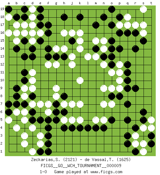 Last move : 1-0 2013 May 22 22:48:24 [Event "FICGS__GO__WCH_TOURNAMENT__000009"] [Site "FICGS"] [Date "2012.12.09"] [Round "1"] [Black "Zeckarias,Simon"] [White "de Vassal,Thibault"] [Result "1-0"] [Rating 1 "2121"] [Rating 2 "1625"] 1.q16 d4 2.q3 c17 3.f3 c6 4.r9 k16 5.k4 e3 6.f4 d11 7.m17 k10 8.d16 d17 9.f16 c16 10.c15 d15 11.d14 e16 12.e15 d16 13.f14 k7 14.f17 c14 15.c13 b15 16.d13 k14 17.c11 d10 18.c10 c9 19.b14 f6 20.q5 r17 21.r16 q17 22.o17 p17 23.p16 s16 24.s15 s17 25.r14 f12 26.b9 c8 27.b8 n14 28.p18 o18 29.n18 q18 30.o19 s19 31.g6 f7 32.f5 n7 33.g7 g8 34.m4 e2 35.f2 p9 36.q7 p12 37.q10 p10 38.c7 d7 39.b7 b6 40.d8 d9 41.d6 e7 42.d5 c5 43.e5 c3 44.h8 g9 45.p14 h7 46.h6 j7 47.o13 n12 48.n13 m13 49.o12 o11 50.q11 p11 51.e1 d1 52.f1 c2 53.m14 l13 54.j15 k15 55.h13 j12 56.o5 r3 57.r4 s2 58.q2 s4 59.s5 n5 60.n4 m5 61.l4 t5 62.s6 r2 63.t3 t4 64.r1 m15 65.o14 n15 66.k18 j16 67.h18 h16 68.e18 d18 69.c15 b16 70.b18 a18 71.a17 b19 72.c19 d19 73.a19 b17 74.c18 h14 75.e17 a16 76.e19 a18 77.g13 g12 78.q12 k5 79.j4 j5 80.h4 h5 81.g5 g14 82.f13 j13 83.o8 o7 84.p8 n9 85.q9 o9 86.a6 a5 87.a7 b4 88.o15 s1 89.t2 1-0 Here are the names of the openings (joseki) played in the four corners : Corner d4 : d4 f3 Hoshi (Hwajeom, Seongjeom, Xingwei`) 4-4 Point. The star or hoshi (4-4) point, emphasizing influence at the potential expense of territory. Ikken Kakari (Hankan Keolch'im, Yi Gua`jiao~, 1-Space Low Approach). Black 2 is the standard approach move to the 4-4. Player Black won this Go (weiqi, baduk) game. Follow this game move after move (download)Never try to cut bamboo joints. (Anonymous) The Internet isn't free. It just has an economy that makes no sense to capitalism. (Brad Shapcott)