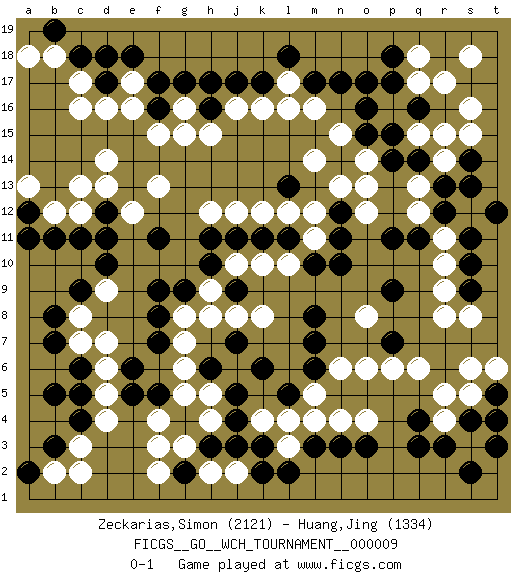 Last move : 0-1 2013 June 17 14:59:21 [Event "FICGS__GO__WCH_TOURNAMENT__000009"] [Site "FICGS"] [Date "2012.12.09"] [Round "1"] [Black "Zeckarias,Simon"] [White "Huang,Jing"] [Result "0-1"] [Rating 1 "2121"] [Rating 2 "1334"] 1.q16 d4 2.q3 d16 3.f17 d14 4.d18 c17 5.j17 r14 6.o17 s16 7.r13 q13 8.r12 q12 9.s14 s15 10.q14 r15 11.q11 r11 12.s11 r10 13.p11 o12 14.s10 r9 15.s9 r8 16.t12 r17 17.s13 q17 18.p14 o13 19.p9 q6 20.n10 n15 21.o16 m12 22.p18 q18 23.n14 o14 24.o15 m14 25.m17 o6 26.n3 l10 27.m8 k8 28.m6 r4 29.r3 s3 30.q4 r5 31.s2 s8 32.k6 g3 33.l11 m11 34.m10 k10 35.l13 l12 36.k11 k12 37.j11 j12 38.h11 h12 39.j9 j10 40.h10 h9 41.g9 h8 42.f11 g8 43.f9 f13 44.f8 g6 45.f7 h5 46.d12 c12 47.c11 c13 48.b11 c7 49.c9 c3 50.p7 p6 51.s4 s5 52.t3 m5 53.l5 n6 54.m7 m4 55.k3 n4 56.m3 o4 57.e5 j2 58.j3 h2 59.j7 j8 60.g4 h4 61.h3 f4 62.g2 f3 63.k2 f2 64.o3 j16 65.h17 k16 66.k17 m16 67.c18 b18 68.d17 c16 69.c5 d5 70.c6 d6 71.b7 d7 72.b5 g15 73.h16 h15 74.b19 a18 75.b3 b2 76.c4 c2 77.p17 q15 78.p15 s18 79.t5 t6 80.t4 s6 81.a2 l17 82.l18 l16 83.n17 c8 84.b8 d9 85.d10 b12 86.a12 a13 87.a11 d13 88.n11 e12 89.d11 e16 90.n12 n13 91.h6 g7 92.f16 e17 93.e18 f15 94.e6 g16 95.f5 g5 96.g17 l4 97.j5 k4 98.j4 l3 99.l2 o8 0-1 Here are the names of the openings (joseki) played in the four corners : Corner d16 : d16 f17 Hoshi (Hwajeom, Seongjeom, Xingwei`) 4-4 Point. The star or hoshi (4-4) point, emphasizing influence at the potential expense of territory. Ikken Kakari (Hankan Keolch'im, Yi Gua`jiao~, 1-Space Low Approach). Black 2 is the standard approach move to the 4-4. Corner q16 : q16 r14 Hoshi (Hwajeom, Seongjeom, Xingwei`) 4-4 Point. The star or hoshi (4-4) point, emphasizing influence at the potential expense of territory. Ikken Kakari (Hankan Keolch'im, Yi Gua`jiao~, 1-Space Low Approach). White 2 is the standard approach move to the 4-4. Corner q4 : q3 r9 Komoku (Somok, Xiao~mu`) 3-4 Point. The komoku (3-4) point is the traditional corner enclosure move.. Player White won this Go (weiqi, baduk) game. Follow this game move after move (download)Don't defend - extend ! (Bill Taylor) Remember : Your focus determines your reality. (Qui-Gon Jinn in Star Wars ep.1)