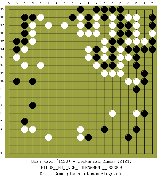 Last move : 0-1 2013 January 28 20:0:40 [Event "FICGS__GO__WCH_TOURNAMENT__000009"] [Site "FICGS"] [Date "2012.12.09"] [Round "1"] [Black "Usan,Kavi"] [White "Zeckarias,Simon"] [Result "0-1"] [Rating 1 "1120"] [Rating 2 "2121"] 1.q16 d4 2.q3 d16 3.r9 k4 4.n4 o17 5.q14 k16 6.d10 c12 7.d7 f3 8.c5 c4 9.l3 k3 10.c17 d17 11.c16 c14 12.c15 d15 13.d18 e18 14.c18 f17 15.b14 b13 16.b15 e12 17.b10 r6 18.r4 o6 19.s6 r17 20.q17 q18 21.p18 r18 22.p17 s15 23.s14 r15 24.r14 r16 25.t15 t16 26.t14 q15 27.p15 o18 28.p19 o16 29.p16 p14 30.o15 q13 31.r13 m16 32.o14 p13 33.r12 p11 34.o19 r10 35.s10 q10 36.s11 m12 37.m14 l14 38.m13 l13 39.n12 n11 40.n18 m17 41.l18 m18 42.m19 k18 43.o12 o11 44.o13 p12 45.t18 n15 46.t17 n14 47.n19 n13 48.l17 l16 49.j18 k17 50.k19 h17 0-1 Here are the names of the openings (joseki) played in the four corners : Corner q16 : q16 o17 Hoshi (Hwajeom, Seongjeom, Xingwei`) 4-4 Point. The star or hoshi (4-4) point, emphasizing influence at the potential expense of territory. Ikken Kakari (Hankan Keolch'im, Yi Gua`jiao~, 1-Space Low Approach). White 2 is the standard approach move to the 4-4. Corner d4 : d4 d7 Hoshi (Hwajeom, Seongjeom, Xingwei`) 4-4 Point. The star or hoshi (4-4) point, emphasizing influence at the potential expense of territory. Niken Takagakari (Dukan Nop'dakeolch'im, E`r Gaojia, 2-Space High Approach). Black 2 is a light approach move. Rarely played in even games, Black 2 is typically employed in handicap games. White continues with 6-4 or 3-10. In Korean Sunjang Baduk White has a stone on 8-4. Player White won this Go (weiqi, baduk) game. Follow this game move after move (download)Territory is a closed space where time no longer exists. The transformation around it slower alter it, and sometimes it cracks open like a rotten egg at the least shock. (Pierre Audouard) The ultimate in disposing one's troops is to be without ascertainable shape. Then the most penetrating spies cannot pry in nor can the wise lay plans against you. (Sun Tzu)