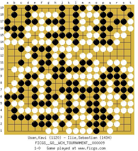 Last move : 1-0 2013 September 13 13:51:7 [Event "FICGS__GO__WCH_TOURNAMENT__000009"] [Site "FICGS"] [Date "2012.11.01"] [Round "1"] [Black "Usan,Kavi"] [White "Ilie,Sebastian"] [Result "1-0"] [Rating 1 "1120"] [Rating 2 "1434"] 1.q16 r4 2.c16 d4 3.j17 r14 4.o16 s16 5.r17 q11 6.c6 c9 7.c3 c4 8.d3 e4 9.b4 b5 10.b3 c5 11.f3 f4 12.g3 h5 13.e9 e10 14.d9 d10 15.c8 b8 16.c7 b7 17.b6 b10 18.a5 e16 19.c13 j3 20.p4 n3 21.r5 q4 22.p3 q5 23.n4 m3 24.n5 p5 25.o4 o7 26.q9 p10 27.r10 r11 28.p9 o9 29.r7 r6 30.s6 s5 31.s8 t6 32.s7 s10 33.q10 o11 34.s9 s11 35.t7 t9 36.t5 t4 37.q6 p6 38.r5 s4 39.p8 q7 40.o8 n8 41.n9 o10 42.n7 m8 43.p7 r6 44.o6 q2 45.m7 m9 46.q3 r3 47.p2 r2 48.l4 l3 49.k4 j4 50.k7 m16 51.l16 m17 52.l15 n15 53.o14 n14 54.e17 f17 55.d17 g16 56.h15 f14 57.c11 c10 58.e12 f9 59.e7 f12 60.f11 e11 61.g11 d12 62.e13 d13 63.f13 e14 64.g13 c14 65.f10 g9 66.g7 h7 67.g5 g4 68.g6 h8 69.h6 j6 70.j7 h2 71.h3 h4 72.g2 e3 73.e2 g1 74.f2 k2 75.m1 n1 76.n2 m2 77.o1 l1 78.k3 n1 79.o2 m1 80.j1 h1 81.j2 k1 82.j2 f7 83.e6 f6 84.f5 f8 85.e5 e8 86.d8 a7 87.a6 m4 88.k6 h12 89.g12 l13 90.j10 k9 91.j9 j8 92.k8 k11 93.h9 g14 94.h14 h13 95.l17 m18 96.l18 h18 97.h17 g18 98.j18 e18 99.d18 b17 100.b15 b14 101.b16 c18 102.e19 f18 103.b19 c19 104.d19 c17 105.a17 d16 106.b18 h16 107.j16 j14 108.j15 k14 109.m19 n19 110.l19 o18 111.s17 s15 112.q18 o15 113.p15 o13 114.p14 p13 115.k10 l9 116.l10 l11 117.m10 n10 118.m11 m12 119.j11 h11 120.h10 k12 121.j12 j13 122.q14 q13 123.p18 o17 124.p17 n16 125.p16 t17 126.t18 t16 127.s19 q8 128.l14 m14 129.k15 k13 130.j19 a15 131.g15 f15 132.g17 f16 133.l8 n9 134.r8 q6 135.p19 r15 136.a16 a14 137.n11 n12 138.g8 m5 139.k5 l6 140.m6 t10 141.o19 n18 142.c15 d15 143.o5 l5 144.l7 t6 145.o7 t8 146.r9 q1 147.pass t5 148.o3 pass 149.pass 1-0 This go game has been lost on time (started : 2012.11.01 20:10:2) Here are the names of the openings (joseki) played in the four corners : Corner q16 : q16 r14 Hoshi (Hwajeom, Seongjeom, Xingwei`) 4-4 Point. The star or hoshi (4-4) point, emphasizing influence at the potential expense of territory. Ikken Kakari (Hankan Keolch'im, Yi Gua`jiao~, 1-Space Low Approach). White 2 is the standard approach move to the 4-4. Corner d4 : d4 c6 Hoshi (Hwajeom, Seongjeom, Xingwei`) 4-4 Point. The star or hoshi (4-4) point, emphasizing influence at the potential expense of territory. Ikken Kakari (Hankan Keolch'im, Yi Gua`jiao~, 1-Space Low Approach). Black 2 is the standard approach move to the 4-4. Corner q4 : r4 p4 Komoku (Somok, Xiao~mu`) 3-4 Point. The komoku (3-4) point is the traditional corner enclosure move.. Ikken Takagakari (Hankan Nop'dakeolch'im, Yi Gaogua`jiao~, 1-Space High Approach). The 5-4 approach move has become more popular in modern times, as modern Go emphasizes speed and influence. Player Black won this Go (weiqi, baduk) game. Follow this game move after move (download)On the second line six die, eight live. (Anonymous) At last I discovered the true beauty of chess. So I proposed to her. (Dinesh De Silva)