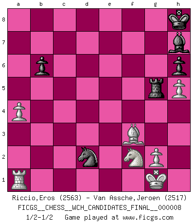Last move : 1/2-1/2 2013 February 24 22:58:45 [Event "FICGS__CHESS__WCH_CANDIDATES_FINAL__000008"] [Site "FICGS"] [Date "2012.11.01"] [Round "1"] [White "Riccio,Eros"] [Black "Van Assche,Jeroen"] [Result "1/2-1/2"] [WhiteElo "2563"] [BlackElo "2517"] 1.e4 c6 2.d4 d5 3.e5 Bf5 4.Nf3 e6 5.Be2 Nd7 6.O-O Ne7 7.Nbd2 h6 8.Nb3 g5 9.Ne1 Qc7 10.Nd3 b6 11.Be3 Bg7 12.f4 c5 13.dxc5 gxf4 14.cxb6 axb6 15.Bxf4 Ng6 16.Bg3 O-O 17.Nd4 Be4 18.a4 Ngxe5 19.c3 Kh7 20.Nf2 Bg6 21.Re1 Rfc8 22.Bb5 Qd8 23.h4 Kh8 24.h5 Bh7 25.Qd2 Nc4 26.Qf4 e5 27.Qxf7 exd4 28.Bxd7 Qg8 29.Qxg8+ Rxg8 30.Be6 dxc3 31.bxc3 Bxc3 32.Bxd5 Bxa1 33.Rxa1 Rxg3 34.Bxa8 Rg5 35.Bf3 Nd2 1/2-1/2 Caro-Kann : Advance variation Kingside Castling by player White (move 6) Kingside Castling by player Black (move 16) This chess game ended in a draw. Follow this game move after move (download)Any material change in a position must come about by mate, a capture, or a Pawn promotion. (Purdy) Es hat in meinem Leben Zeiten gegeben, da ich sehr nahe daran war zu glauben, daß ich auch nicht eine einzige Schachpartie verlieren könnte. (José Raúl Capablanca) Estaba muy claro de que el punto vulnerable del Gran Maestro Americano (Bobby Fischer) radicaba en las posiciones de doble filo, colgantes, irracionales, donde el siempre falló en encontrar un triunfo aún en una posición de clara victoria. (Efim Geller) Ce qui est bien, c'est d'avoir tout un tas de pièces en prise : l'adversaire ne peut en prendre qu'une à la fois. Cité par Thierry Audin. Don't anthropomorphize computers - they hate it. (Anonymous)