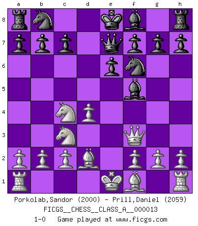 Last move : 1-0 2007 March 5 0:31:41 [Event "FICGS__CHESS__CLASS_A__000013"] [Site "FICGS"] [Date "2007.01.18"] [Round "1"] [White "Porkolab,Sandor"] [Black "Prill,Daniel"] [Result "1-0"] [WhiteElo "2000"] [BlackElo "2059"] 1.e4 d5 2.exd5 Qxd5 3.Nc3 Qa5 4.d4 Nf6 5.Nf3 Bf5 6.Ne5 e6 7.Nc4 Qb4 8.Bd2 Qe7 9.Qf3 1-0 This chess game has been lost on time (started : 2007.01.18 8:25:49) Scandinavian defense Player White won this chess game. Follow this game move after move (download)For surely of all the drugs in the world, Chess must be the most permanently pleasurable. (Assiac) Schach ist Kampf, hauptsächlich jedoch gegen die eigenen Fehler. (Savielly Grigorievitsch Tartakower) Todos los jugadores de Ajedrez deberían tener un pasatiempo. (Savielly Tartakower) Les Echecs mettent en conflit, non pas deux intelligences, mais deux volontés. (Lasker) Home computers are being called upon to perform many new functions, including the consumption of homework formerly eaten by the dog. (Doug Larson)