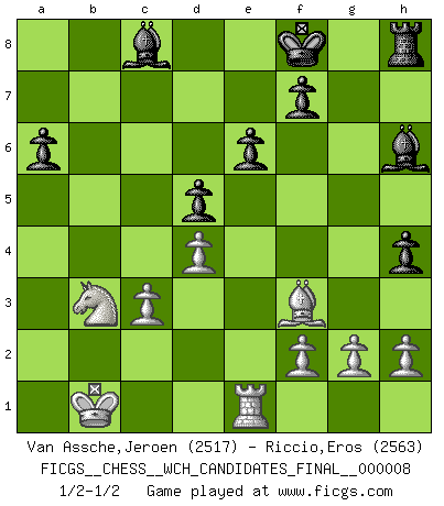Last move : 1/2-1/2 2013 March 11 21:50:4 [Event "FICGS__CHESS__WCH_CANDIDATES_FINAL__000008"] [Site "FICGS"] [Date "2012.11.01"] [Round "6"] [White "Van Assche,Jeroen"] [Black "Riccio,Eros"] [Result "1/2-1/2"] [WhiteElo "2517"] [BlackElo "2563"] 1.e4 c5 2.Nf3 d6 3.d4 cxd4 4.Nxd4 Nf6 5.Nc3 a6 6.Bg5 e6 7.Qf3 h6 8.Be3 Qc7 9.O-O-O Nbd7 10.Qg3 b5 11.a3 Rb8 12.Kb1 b4 13.axb4 Rxb4 14.Nb3 Nxe4 15.Nxe4 Rxe4 16.Bd3 Ra4 17.Bd4 h5 18.Rhe1 h4 19.Qg5 Nf6 20.Bxf6 gxf6 21.Qxf6 Rg8 22.Be4 Be7 23.Qh6 d5 24.Qh7 Kf8 25.Bf3 Bf6 26.Qh6+ Bg7 27.Qe3 Rc4 28.c3 Rh8 29.Rd4 Rxd4 30.cxd4 Bh6 31.Qc3 Qxc3 32.bxc3 1/2-1/2 Sicilian : Najdorf, 6...e6 Queenside Castling by player White (move 9) This chess game ended in a draw. Follow this game move after move (download)Do you realize Fischer almost never has any bad pieces? He exchanges them, and the bad pieces remain with his opponents. (Yuri Balashov) Ich war zu klein für die Schach-Schülermannschaft! (Woody Allen) El Ajedrez es el juego mas altamente simbólico, pero las agresiones estan por lo tanto aún mas francamente representadas en la partida. Tal vez comenzo como un juego de guerra; Algo como la representación de una batalla en miniatura entre las fuerzas de dos reinos. (Karl Meninger) Vous savez, camarade Pachman, je n'éprouve pas de plaisir à être ministre, je jouerais plutôt aux échecs comme vous, ou alors ferais une révolution au Venezuela. (Che Guevara à Ludek Pachman, 'Checkmate in Prague', 1975) Perseverance does not equal worthiness. Next time you want to get my attention, wear something fun. Low-riding jeans are hot. (Gregory House, House M.D.)