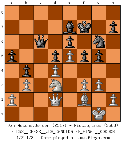 Last move : 1/2-1/2 2013 March 23 12:47:24 [Event "FICGS__CHESS__WCH_CANDIDATES_FINAL__000008"] [Site "FICGS"] [Date "2012.11.01"] [Round "8"] [White "Van Assche,Jeroen"] [Black "Riccio,Eros"] [Result "1/2-1/2"] [WhiteElo "2517"] [BlackElo "2563"] 1.e4 c5 2.Nf3 d6 3.Bb5+ Bd7 4.Bxd7+ Qxd7 5.O-O Nf6 6.Qe2 Nc6 7.c3 e6 8.d4 cxd4 9.cxd4 d5 10.e5 Ne4 11.Be3 Be7 12.Ne1 f6 13.f3 Ng5 14.Nd3 O-O 15.Nd2 Rac8 16.Rac1 b6 17.Bf2 Nf7 18.Rfd1 Nh8 19.Nb3 f5 20.g3 g5 21.Rd2 a5 22.Rdc2 Ng6 23.Nd2 Kg7 24.Nb1 Nb4 25.Rxc8 Rxc8 26.Nc3 Nxd3 27.Qxd3 b5 28.Ne2 Rxc1+ 29.Nxc1 Qc6 30.Qd2 b4 31.Nd3 Kf7 32.b3 1/2-1/2 Jeroen Van Assche Eros, congratulations for winning the match. I think I have to work on my openings before I can ever beat you! Sicilian : Canal-Sokolsky attack, 3...Bd7 Kingside Castling by player White (move 5) Kingside Castling by player Black (move 14) This chess game ended in a draw. Follow this game move after move (download)Chess makes man wiser and clear-sighted. (Vladimir Putin) Es ist peinlich, dass ich nie Weltmeister wurde. Es wäre leicht, Leonid Breschnjew als Ursache vorzuschieben, dessen Apparat den Vorzeigekommunisten Anatoli Karpow in allem unterstützte. Aber Garri Kasparow zum Beispiel, der ebenfalls von den Sowjets unerwünscht war, hat trotz der Widerstände den WM-Titel erobert. (Viktor Kortschnoi) Fischer es el jugador mas fuerte del mundo. De hecho, el jugador mas fuerte que jamas haya existido. (Larry Evans) Karpov est une pièce de musée. (Garry Kasparov) Wipe them out. All of them. (Darth Sidious in Star Wars ep.1)
