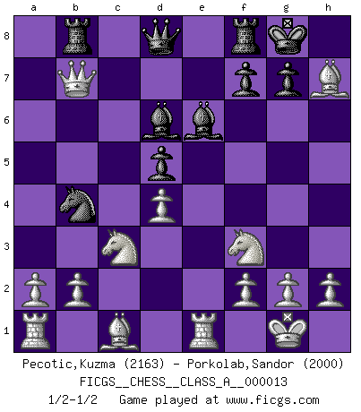 Last move : 1/2-1/2 2007 February 16 23:43:19 [Event "FICGS__CHESS__CLASS_A__000013"] [Site "FICGS"] [Date "2007.01.18"] [Round "1"] [White "Pecotic,Kuzma"] [Black "Porkolab,Sandor"] [Result "1/2-1/2"] [WhiteElo "2163"] [BlackElo "2000"] 1.e4 e5 2.Nf3 Nf6 3.Nxe5 d6 4.Nf3 Nxe4 5.d4 d5 6.Bd3 Bd6 7.O-O O-O 8.c4 c6 9.Re1 Bf5 10.Qb3 Na6 11.cxd5 cxd5 12.Nc3 Be6 13.Qxb7 Nb4 14.Bxe4 Rb8 15.Qxa7 Ra8 16.Qb7 Rb8 17.Bxh7+ 1/2-1/2 Petrov : Classical attack, Marshall variation Kingside Castling by player White (move 7) Kingside Castling by player Black (move 7) This chess game ended in a draw. Follow this game move after move (download)You know you're going to lose. Even when I was ahead I knew I was going to lose. - On playing against Fischer. (Andrew Soltis) Ich bin es gewohnt, das die Jugend mir überhaupt keinen Respekt entgegenbringt. (Alexander Morozewich) ¡Examina movidas que hagan daño! Un buen ojo for movidas desvastantes es mucho mas importante que el conocimiento de principios estratégicos. (Purdy) Aux échecs, l'amour-propre est satisfait quand on remporte la victoire, mais il n'y a pas de honte à être battu. (Benjamin Franklin) If only people were all showed a certain minimum level of niceness; if only people didn't retract verbal draw offers (without draw box ticked) on ficgs; if only people didn't kill; if only people didn't run concentration / extermination camps, if only people didn't drop nuclear bombs on Hiroshima and Nagasaki, and so on - it would be a much more beautiful world. But sadly, things are not so... (Normajean Yates)