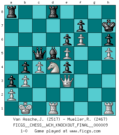 Last move : 1-0 2013 March 26 4:45:6 [Event "FICGS__CHESS__WCH_KNOCKOUT_FINAL__000009"] [Site "FICGS"] [Date "2012.11.01"] [Round "7"] [White "Van Assche,Jeroen"] [Black "Mueller,Robert"] [Result "1-0"] [WhiteElo "2517"] [BlackElo "2467"] 1.e4 e6 2.d4 d5 3.Nc3 Nf6 4.e5 Nfd7 5.f4 c5 6.Nf3 Nc6 7.Be3 a6 8.Qd2 cxd4 9.Nxd4 Bc5 10.O-O-O O-O 11.Qf2 Nxd4 12.Bxd4 Bxd4 13.Qxd4 b5 14.Bd3 Bb7 15.Ne2 Qc7 16.Qe3 Nc5 17.Nd4 b4 18.Kb1 Ne4 19.g4 Rfc8 20.h4 a5 21.Rh2 Qb6 22.Bxe4 dxe4 23.f5 Qc5 24.Qf4 Bd5 25.f6 a4 26.h5 Rd8 27.b3 a3 28.Qg5 Qf8 29.R2h1 h6 30.Qe3 Qc5 31.g5 gxf6 32.gxf6 Kh7 33.c4 1-0 Alexis Alban Identical to game 5 Karol Waciak Isn't that a miracle or sth? Karol Waciak Isn't that a miracle or sth? Thibault de Vassal No miracle here... that happens when starting simultaneous games against the same player (obviously shows that player white wants a match-draw or is overloaded - IMHO) French : Steinitz, Boleslavsky variation Queenside Castling by player White (move 10) Kingside Castling by player Black (move 10) Player White won this chess game. Follow this game move after move (download)It is peculiar but a fact nevertheless, that gamblers in chess always have enthusiastic followers. (Botvinnik) Ich bin Weltmeister und muß mit niemandem irgend etwas diskutieren. (Viswanathan Anand) Te sientas frente a un tablero y repentinamente tu corazón brinca. Tu mano tiembla al tomar una pieza y moverla. Pero lo que el Ajedrez te enseña es que tu debes permanecer ahí con calma y pensar de que si realmente es una buena idea o de que si hay otras ideas mejores. (Stanley Kubrick) Les ravages du H expliquent la différence de niveau entre Tal et Thal [Abergel]. The difference between perseverance and obstinacy is that one comes from a strong will, and the other from a strong won't. (Henry Ward Beecher)