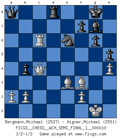 Last move : 1/2-1/2 2013 February 23 6:41:48 [Event "FICGS__CHESS__WCH_SEMI_FINAL_1__000010"] [Site "FICGS"] [Date "2012.11.01"] [Round "4"] [White "Bergmann,Michael"] [Black "Aigner,Michael"] [Result "1/2-1/2"] [WhiteElo "2537"] [BlackElo "2551"] 1.d4 Nf6 2.c4 g6 3.Nc3 d5 4.Nf3 Bg7 5.Qb3 dxc4 6.Qxc4 O-O 7.e4 a6 8.Be2 b5 9.Qb3 c5 10.dxc5 Be6 11.Qc2 Nbd7 12.Be3 Rc8 13.Rd1 b4 14.Nd5 Bxd5 15.exd5 Nxc5 16.O-O Qd6 17.Rc1 Qb8 18.Rfd1 a5 19.h3 Nce4 20.Qd3 Rxc1 21.Rxc1 Qb7 22.g4 h6 23.Rc4 Nd6 24.Rc6 h5 25.g5 Nfe4 26.Nd4 e6 27.Nb3 Re8 28.Nxa5 Qa8 29.Nc4 Nxc4 30.Qxc4 exd5 31.Qxd5 Nxg5 32.h4 Ne6 33.Bf3 Rd8 34.Qc4 1/2-1/2 King's Indian defense, 3.Nc3 Kingside Castling by player Black (move 6) Kingside Castling by player White (move 16) This chess game ended in a draw. Follow this game move after move (download)Why must I lose to this idiot ? (Aron Nimzovich) Capablanka war das größte Genie der Schachgeschichte! Aber denken sie nicht er habe nichts vom Schach verstanden. Er wusste nur soviel wie er wissen musste um seine Ziele zu erreichen. (Mikhail Moiseyevich Botvinik) ¿Cual es el objetivo de jugar una apertura de gambito?... Para adquirir una reputación de ser un jugador apuesto a costo de perder el juego. (Siegbert Tarrasch) L'ordinateur a tué l'originalité. Il n'y a plus guère d'aventures sur l'échiquier. (Jacob Murray) The weakness of an artist is dogma. (Josh Waitzkin)