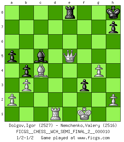 Last move : 1/2-1/2 2013 May 18 10:2:9 [Event "FICGS__CHESS__WCH_SEMI_FINAL_2__000010"] [Site "FICGS"] [Date "2012.11.01"] [Round "3"] [White "Dolgov,Igor"] [Black "Nemchenko,Valery"] [Result "1/2-1/2"] [WhiteElo "2527"] [BlackElo "2516"] 1.e4 c5 2.Nf3 Nc6 3.d4 cxd4 4.Nxd4 Nf6 5.Nc3 e5 6.Ndb5 d6 7.Bg5 a6 8.Na3 b5 9.Nd5 Be7 10.Bxf6 Bxf6 11.c4 b4 12.Nc2 a5 13.Be2 O-O 14.O-O Bg5 15.Qd3 Be6 16.Rad1 Rc8 17.b3 g6 18.Kh1 Re8 19.g3 Bh6 20.Nde3 Bf8 21.Bg4 Qe7 22.Qd2 Kh8 23.Nd5 Qd8 24.f3 Bg7 25.Kg2 f5 26.Bh3 Rf8 27.Kh1 Qe8 28.Qg2 Ne7 29.Nce3 Nxd5 30.Nxd5 Rf7 31.f4 Qf8 32.exf5 gxf5 33.fxe5 dxe5 34.Qf2 Rb8 35.Bg2 Qe8 36.Qc5 Bf8 37.Qe3 Bg7 38.Bf3 Rd7 39.Qc5 e4 40.Be2 Qc8 41.Qe3 Qe8 42.Qf4 Qf8 43.Qh4 Rbd8 44.Nf4 Bf7 45.Rd5 Rxd5 46.cxd5 Rd6 47.Bc4 e3 48.Qg5 Rf6 49.Re1 Qd8 50.Ne6 Bxe6 51.dxe6 Bh6 52.Qh5 Qa8+ 53.Kg1 Qe4 54.Qh4 Qe5 55.Rd1 e2 56.Bxe2 f4 57.Bc4 Bf8 58.g4 f3 59.Kf1 Rxe6 60.Qd8 Re8 61.Qd4 Bc5 62.Qxe5+ 1/2-1/2 Sicilian : Pelikan (Lasker/Sveshnikov) variation Kingside Castling by player Black (move 13) Kingside Castling by player White (move 14) This chess game ended in a draw. Follow this game move after move (download)It's always better to sacrifice your opponent's men. (Savielly Tartakover) Wer wird heute Abend ihr Gegner sein? -- Heute Abend spiele ich gegen die schwarzen Steine. (Akiba Rubinstein) Tu puedes aprender mucho mas de una partida que pierdas que de una partida ganada. Tendras que perder cientos de partidas antes de llegar a ser un buen jugador. (Jose Raul Capablanca) Des combinaisons [dans le jeu d'échecs] pareilles à des mélodies. Je crois entendre pour ainsi dire la musique des coups... (Vladimir Nabokov) Luck never gives; it only lends. (Swedish proverb)