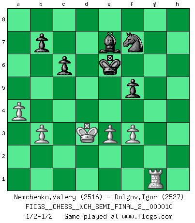 Last move : 1/2-1/2 2013 February 13 16:51:0 [Event "FICGS__CHESS__WCH_SEMI_FINAL_2__000010"] [Site "FICGS"] [Date "2012.11.01"] [Round "4"] [White "Nemchenko,Valery"] [Black "Dolgov,Igor"] [Result "1/2-1/2"] [WhiteElo "2516"] [BlackElo "2527"] 1.d4 d5 2.c4 c6 3.Nf3 Nf6 4.Nc3 dxc4 5.a4 Bf5 6.Ne5 Nbd7 7.Nxc4 Qc7 8.g3 e5 9.dxe5 Nxe5 10.Bf4 Nfd7 11.Bg2 g5 12.Ne3 gxf4 13.Nxf5 O-O-O 14.Qc2 Nc5 15.O-O fxg3 16.hxg3 a5 17.Rfd1 h5 18.Rxd8+ Qxd8 19.Rd1 Qf6 20.Qd2 Kb8 21.Qf4 Ka7 22.Kf1 h4 23.gxh4 Rh5 24.Bh3 Ng6 25.Qc7 Na6 26.Qxa5 Nxh4 27.Qd8 Rxf5 28.Bxf5 Be7 29.Qd4+ Qxd4 30.Rxd4 Nxf5 31.Re4 Bf8 32.e3 Kb6 33.Ke2 Nd6 34.Rg4 Kc7 35.Na2 Nc5 36.Nc1 Be7 37.Nd3 Nxd3 38.Kxd3 f5 39.Rg7 Kd7 40.f3 Ke6 41.Rg6+ Kf7 42.Rg1 Ke6 43.b3 Nf7 1/2-1/2 QGD Slav : Krause attack Queenside Castling by player Black (move 13) Kingside Castling by player White (move 15) This chess game ended in a draw. Follow this game move after move (download)Openings teach you openings. Endgames teach you chess ! (Stephan Gerzadowicz) Der zweitbeste Zug ist oft der einzig richtige. (Savielly Grigorievitsch Tartakower) Si tu oponente te ofrece un empate, trata de averiguar porque piensa él que esta en una posición peor. (Nigel Short) Shah mat. Le roi est mort. Cri de fierté d'un joueur venant de terrasser son adversaire, courtoisement, sans effusion de sang. Patience, use the Force, think ! (Obi-Wan Kenobi in Star Wars ep.2)