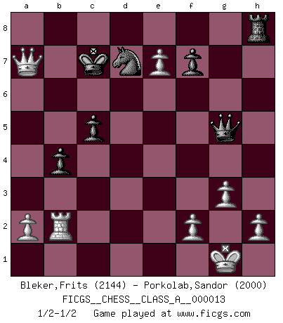 Last move : 1/2-1/2 2007 May 16 19:17:9 [Event "FICGS__CHESS__CLASS_A__000013"] [Site "FICGS"] [Date "2007.01.18"] [Round "1"] [White "Bleker,Frits"] [Black "Porkolab,Sandor"] [Result "1/2-1/2"] [WhiteElo "2144"] [BlackElo "2000"] 1.d4 d5 2.Nf3 Nf6 3.c4 c6 4.Nc3 e6 5.Bg5 dxc4 6.e4 b5 7.e5 h6 8.Bh4 g5 9.Nxg5 hxg5 10.Bxg5 Nbd7 11.exf6 Bb7 12.g3 c5 13.d5 Qb6 14.Bg2 O-O-O 15.O-O b4 16.Rb1 Qa6 17.dxe6 Bxg2 18.e7 Bxf1 19.Kxf1 Bxe7 20.fxe7 Rdg8 21.Ne4 c3 22.Kg1 Rxg5 23.Nxg5 Qg6 24.Qf1 cxb2 25.Rxb2 Qxg5 26.Qa6+ Kc7 27.Qxa7+ 1/2-1/2 Queen's pawn game Queenside Castling by player Black (move 14) Kingside Castling by player White (move 15) This chess game ended in a draw. Follow this game move after move (download)Blessed be the memory of him who gave the world this immortal game. (A. G. Gardiner) Wenn man heute mit 14 Jahren noch kein GM ist, kann man es vergessen. (Viswanathan Anand) Cuando no sepas que mover, espera por una idea que se le venga a la la cabeza de tu oponente. Tenlo por seguro de que esa idea estará incorrecta. (Siegbert Tarrasch) Mon pion favori sur ma case favorite ! Bronstein en parlant d'un coup de pion en h5 quand il avait les Noirs. Creativity is allowing yourself to make mistakes. Art is knowing which ones to keep. (Scott Adams)