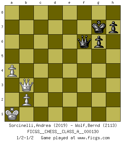 Last move : 1/2-1/2 2012 November 17 16:1:3 [Event "FICGS__CHESS__CLASS_A__000130"] [Site "FICGS"] [Date "2012.11.04"] [Round "1"] [White "Sorcinelli,Andrea"] [Black "Wolf,Bernd"] [Result "1/2-1/2"] [WhiteElo "2019"] [BlackElo "2113"] 1.e4 c5 2.Nf3 d6 3.d4 cxd4 4.Nxd4 Nf6 5.Nc3 a6 6.f3 e5 7.Nb3 Be6 8.Be3 Be7 9.Qd2 O-O 10.O-O-O Nbd7 11.g4 b5 12.g5 b4 13.Ne2 Ne8 14.f4 g6 15.h4 a5 16.Kb1 Ng7 17.h5 a4 18.Nbc1 Qc7 19.Nd3 b3 20.cxb3 axb3 21.a3 d5 22.hxg6 fxg6 23.exd5 Bxd5 24.Rh2 Rad8 25.Rc1 Qb7 26.Nc3 Bf3 27.Rh3 Rf7 28.Rxf3 Qxf3 29.Bg2 Qg4 30.Bd5 exf4 31.Bxf7+ Kxf7 32.Rf1 Bxg5 33.Nxf4 Qf5+ 34.Ka1 Kg8 35.Qd1 Bxf4 36.Rxf4 Qe6 37.Re4 Qf7 38.Bg5 Re8 39.Rxe8+ Nxe8 40.Nd5 Nef6 41.Nxf6+ Nxf6 42.Bxf6 Qxf6 43.Qxb3+ Kg7 44.a4 1/2-1/2 Sicilian : Najdorf Kingside Castling by player Black (move 9) Queenside Castling by player White (move 10) 10 pieces endgame at move 42 : White KQBPP , Black KQPPP WHITE : King + 1 Queen 1 Bishop 2 Pawns BLACK : King + 1 Queen 3 Pawns 9 pieces endgame at move 42 : White KQPP , Black KQPPP WHITE : King + 1 Queen 2 Pawns BLACK : King + 1 Queen 3 Pawns 8 pieces endgame at move 43 : White KQPP , Black KQPP WHITE : King + 1 Queen 2 Pawns BLACK : King + 1 Queen 2 Pawns This chess game ended in a draw. Follow this game move after move (download)You need not play well - just help your opponent to play badly. (Genrikh Chepukaitis) Ich habe kein Problem mit Frauen, sondern nur mit dem Niveau ihres Schachspiels (Judith Polgar) En el tablero, la mentira e hipocresía no sobreviven mucho. (Emanuel Lasker) Seul un grand joueur sait à quel point il joue faiblement. (Xavier Tartacover) Never risk one's whole fortune unless supported by one's entire army. (Niccolo Machiavelli)