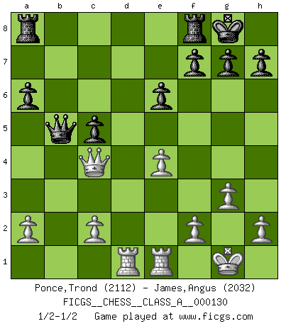 Last move : 1/2-1/2 2012 December 21 10:40:33 [Event "FICGS__CHESS__CLASS_A__000130"] [Site "FICGS"] [Date "2012.11.04"] [Round "1"] [White "Ponce,Trond"] [Black "James,Angus"] [Result "1/2-1/2"] [WhiteElo "2112"] [BlackElo "2032"] 1.e4 c5 2.Nf3 d6 3.d4 cxd4 4.Qxd4 Nc6 5.Bb5 Bd7 6.Bxc6 Bxc6 7.Nc3 Nf6 8.Bg5 e6 9.O-O Be7 10.Rad1 O-O 11.Rfe1 a6 12.Bxf6 Bxf6 13.Qxd6 Bxc3 14.bxc3 Qa5 15.Nd4 Qxc3 16.Nxc6 bxc6 17.Qd3 Qa5 18.Qc4 c5 19.g3 Qb5 1/2-1/2 Sicilian, Chekhover variation Kingside Castling by player White (move 9) Kingside Castling by player Black (move 10) This chess game ended in a draw. Follow this game move after move (download)Who is your opponent tonight, tonight I am playing against the Black pieces. (Akiba Rubinstein) Schach wird sich dank seiner hohen kulturellen Tradition immer durchsetzen. In näherer Zukunft womöglich sogar als Gegenreaktion auf die maßlose Reizüberflutung im Freizeit- und Spielbereich. (Garry Kasparov) El Ajedrez se juega con la mente... ¡no con las manos!. (Renaud y Kahn) 'L'échange des dames est un coup dur pour les deux adversaires...' Un journaliste lors d'une partie du match Spassky-Fischer Who needs drugs and alcohol if he can play Big Chess at FICGS ? (Heinz-Georg Lehnhoff)