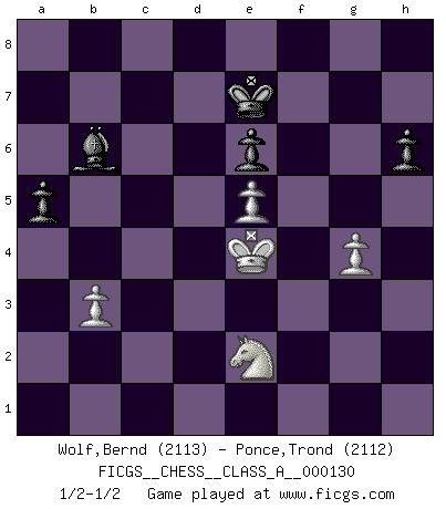 Last move : 1/2-1/2 2012 December 3 12:21:43 [Event "FICGS__CHESS__CLASS_A__000130"] [Site "FICGS"] [Date "2012.11.04"] [Round "1"] [White "Wolf,Bernd"] [Black "Ponce,Trond"] [Result "1/2-1/2"] [WhiteElo "2113"] [BlackElo "2112"] 1.e4 c6 2.d4 d5 3.Nc3 dxe4 4.Nxe4 Bf5 5.Ng3 Bg6 6.h4 h6 7.Nf3 Nd7 8.h5 Bh7 9.Bd3 Bxd3 10.Qxd3 e6 11.Bf4 Qa5+ 12.Bd2 Bb4 13.c3 Be7 14.c4 Qc7 15.O-O-O Ngf6 16.Rhe1 a5 17.Kb1 O-O 18.Ne5 Nxe5 19.dxe5 Rfd8 20.Qe2 Nd7 21.f4 Nc5 22.Rf1 b5 23.cxb5 cxb5 24.Be3 Na6 25.Rxd8+ Rxd8 26.Qxb5 Nb4 27.Rc1 Rd1 28.Qe2 Rxc1+ 29.Bxc1 Nxa2 30.Qc2 Qxc2+ 31.Kxc2 Nxc1 32.Kxc1 f6 33.Kc2 fxe5 34.fxe5 g6 35.hxg6 Kg7 36.Kd3 Kxg6 37.Ke4 Bg5 38.b3 Kf7 39.Ne2 Bd8 40.Nd4 Bb6 41.g4 Ke7 42.Ne2 1/2-1/2 Caro-Kann : Classical, 7...Nd7 Queenside Castling by player White (move 15) Kingside Castling by player Black (move 17) 10 pieces endgame at move 36 : White KNPPP , Black KBPPP WHITE : King + 1 Knight 3 Pawns BLACK : King + 1 Bishop 3 Pawns This chess game ended in a draw. Follow this game move after move (download)The Chess pieces are the block alphabet which shapes thoughts; and these thoughts, although making a visual design on the chessboard, express their beauty abstractly, like a poem. (Marcel Duchamp) Ja, ich habe einmal eine Blitzpartie gespielt, es war in einem Zug, 1929. --im Interview 1989 (Mikhail Moiseyevich Botvinik) El Ajedrez moderno está demasiado preocupado con cosas como la estructura de Peones. Olvidenlo, el Jaque Mate termina la partida. (Nigel Short) J'ai toujours senti une vague pitié pour l'homme qui ne connaît rien aux échecs, tout comme j'en aurais pour un homme ignorant de l'amour. Les Echecs, comme la musique ou comme l'amour, ont le pouvoir de rendre heureux. (Siegbert Tarrasch) Internal peace cannot coexist with external war. (Don Groves)