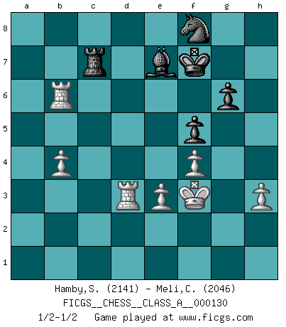 Last move : 1/2-1/2 2013 September 28 8:5:6 [Event "FICGS__CHESS__CLASS_A__000130"] [Site "FICGS"] [Date "2012.11.04"] [Round "1"] [White "Hamby,Stephen"] [Black "Meli,Cosimo Leonardo"] [Result "1/2-1/2"] [WhiteElo "2141"] [BlackElo "2046"] 1.c4 e5 2.g3 Nf6 3.Bg2 c6 4.d4 exd4 5.Qxd4 d5 6.Nf3 dxc4 7.Qxc4 Be7 8.O-O O-O 9.Nc3 Na6 10.Rd1 Qa5 11.Nd4 Rd8 12.Bf4 Qb4 13.Qxb4 Nxb4 14.Be5 Ng4 15.Bc7 Rd7 16.Ba5 Ne5 17.Rac1 g6 18.Bh3 f5 19.Bg2 Bf8 20.Rb1 Rb8 21.e3 Nc4 22.Bxb4 Bxb4 23.Na4 Ne5 24.Rbc1 Bf8 25.h3 Rd8 26.Nc5 a5 27.f4 Nf7 28.Bf3 Re8 29.Kf2 Be7 30.Ndb3 Bd8 31.Nd4 Kg7 32.b3 h5 33.Na6 Ra8 34.Nxc6 bxc6 35.Bxc6 Re7 36.Bxa8 Bxa6 37.Rc3 h4 38.gxh4 Ra7 39.Bf3 Bxh4+ 40.Kg2 Bb5 41.Rc8 Re7 42.Rc5 Be8 43.Rd3 Ra7 44.Bc6 Be7 45.R5c3 Bxc6+ 46.Rxc6 Nd8 47.Rb6 Rc7 48.a3 Kf7 49.b4 axb4 50.axb4 Ne6 51.Kf3 Nf8 1/2-1/2 English Opening Kingside Castling by player White (move 8) Kingside Castling by player Black (move 8) This chess game ended in a draw. Follow this game move after move (download)The only thing Chess players have in common is Chess. (Lodewijk Prins) Ich bewundere Kasparows phantasievolle Angriffssiege aus den Achtzigern und Neunzigern, aber wenn man sie mit dem Computer überprüft, nimmt der Computer in jeder zweiten Partie die Opfer an, verteidigt sich und gewinnt. (Vladimir Kramnik) Muchos jugadores de Ajedrez se sorprendían cuando después de la partida, Fischer explicaba con calma: 'Yo ya había analizado esta posibilidad' en una posición en la cual yo creía que no era posible de prever desde la apertura. (Mikhail Tal) Les Echecs ne sont pas pour les âmes timides. Ils requièrent un homme entier, qui ne s'arrête pas aveuglément à ce qui a été déjà établi, mais qui tente individuellement de sonder les profondeurs du jeu. (W. Steinitz) If you ain't just a little scared when you enter a casino, you are either very rich or you haven't studied the games enough. (Pappy)