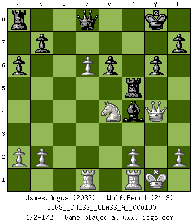 Last move : 1/2-1/2 2013 March 18 12:20:17 [Event "FICGS__CHESS__CLASS_A__000130"] [Site "FICGS"] [Date "2012.11.04"] [Round "1"] [White "James,Angus"] [Black "Wolf,Bernd"] [Result "1/2-1/2"] [WhiteElo "2032"] [BlackElo "2113"] 1.e4 c5 2.Nf3 Nc6 3.Bb5 g6 4.O-O Bg7 5.c3 Nf6 6.e5 Nd5 7.d4 cxd4 8.cxd4 O-O 9.Nc3 Nc7 10.Bf4 Nxb5 11.Nxb5 a6 12.Nc3 d5 13.exd6 Bg4 14.d5 Nd4 15.Qe1 Nxf3+ 16.gxf3 Bxf3 17.Qe3 e5 18.dxe6 fxe6 19.Qxf3 Be5 20.Qg4 Bxf4 21.Rad1 Rf5 22.Ne4 Qb6 23.Qh4 Qd8 24.Qg4 1/2-1/2 Sicilian : Nimzovich-Rossolimo attack (with ...g6, without ...d6) Kingside Castling by player White (move 4) Kingside Castling by player Black (move 8) This chess game ended in a draw. Follow this game move after move (download)We must make sure that Chess will not be like a dead language, very interesting, but for a very small group. (Sytze Faber) Den Ruhm habe ich schon, jetzt brauche ich noch das Geld. (Wilhelm Steinitz) Debió haber existido una vez en que los hombres eran semidióses, de otra manera no hubiesen podido inventar el Ajedrez. (Gustav Schenk) Les erreurs sont comme les malheurs, elles n'arrivent jamais seules. (Siegbert Tarrasch) I have opinions of my own - strong opinions - but I don't always agree with them. (George Bush)