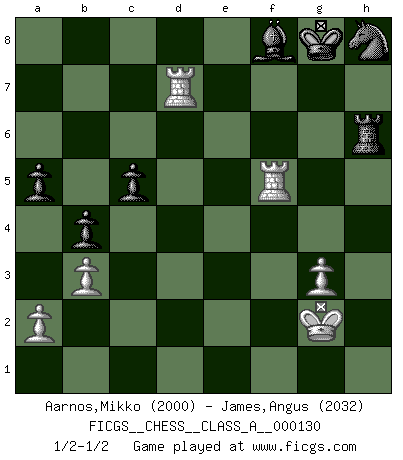 Last move : 1/2-1/2 2013 August 7 6:56:26 [Event "FICGS__CHESS__CLASS_A__000130"] [Site "FICGS"] [Date "2012.11.04"] [Round "1"] [White "Aarnos,Mikko"] [Black "James,Angus"] [Result "1/2-1/2"] [WhiteElo "2000"] [BlackElo "2032"] 1.Nf3 d5 2.d4 Nf6 3.c4 e6 4.Nc3 Be7 5.Bg5 O-O 6.e3 Nbd7 7.Rc1 a6 8.c5 c6 9.Bd3 e5 10.dxe5 Ne8 11.h4 Nxc5 12.Bb1 f6 13.Qc2 g6 14.Bh6 Bf5 15.Qe2 Bxb1 16.Rxb1 Ng7 17.h5 g5 18.O-O fxe5 19.e4 d4 20.Qc4+ Kh8 21.Nxe5 dxc3 22.Qxc3 Nce6 23.Rbd1 Qe8 24.Bxg7+ Nxg7 25.Nd7 h6 26.Nxf8 Bxf8 27.Rd3 b5 28.Rfd1 b4 29.Qf6 Qe6 30.Rf3 Re8 31.e5 Kg8 32.g3 c5 33.b3 a5 34.Kg2 Be7 35.Qg6 Qxg6 36.hxg6 Ne6 37.Rf7 Nf8 38.e6 Nxg6 39.f4 Nh8 40.Rf5 Bf8 41.fxg5 Rxe6 42.gxh6 Rxh6 43.Rd8 Nf7 44.Rd7 Nh8 1/2-1/2 Reti Opening Kingside Castling by player Black (move 5) Kingside Castling by player White (move 18) This chess game ended in a draw. Follow this game move after move (download)Whoever sees no other aim in the game than that of giving checkmate to one's opponent will never become a good Chess player. (Euwe) Ich liebe den Moment, wenn ich das Ego meines Gegenüber breche. (Robert James Fischer) En el tablero, la mentira e hipocresía no sobreviven mucho. (Emanuel Lasker) Que feriez-vous si vous étiez en train de jouer aux échecs et que la fin du monde arrive ? Je continuerais à jouer. (Saint Borromée) Think like a man of action, act like a man of thought. (Henri Louis Bergson)