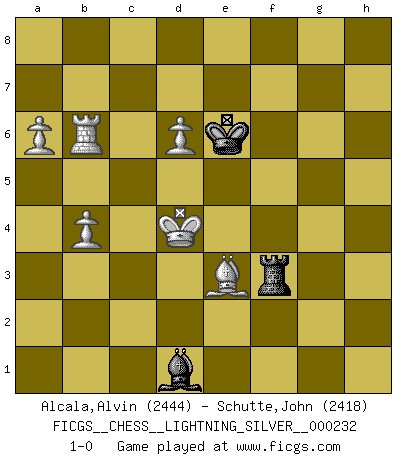 Last move : 1-0 2012 November 4 21:49:6 [Event "FICGS__CHESS__LIGHTNING_SILVER__000232"] [Site "FICGS"] [Date "2012.11.04"] [Round "1"] [White "Alcala,Alvin"] [Black "Schutte,John"] [Result "1-0"] [WhiteElo "2444"] [BlackElo "2418"] 1.c4 e5 2.g3 Nf6 3.Bg2 d5 4.cxd5 Nxd5 5.Nc3 Nb6 6.e3 Nc6 7.Nge2 Bd6 8.O-O O-O 9.d4 Re8 10.d5 Ne7 11.b3 Bg4 12.h3 Bh5 13.g4 Bg6 14.Bb2 Qd7 15.a4 Rad8 16.Ng3 a6 17.a5 Nbc8 18.h4 h6 19.Qe2 Bb4 20.h5 Bh7 21.Rfd1 Nd6 22.Ra4 Bxc3 23.Bxc3 Nec8 24.e4 Na7 25.Bb2 Nab5 26.R4a1 Qe7 27.Qe1 Qf6 28.Rac1 Nd4 29.Qe3 N6b5 30.Ne2 Nxe2+ 31.Qxe2 Kh8 32.f3 Rd7 33.Bf1 Qf4 34.Rc5 Nd6 35.Bc1 Qg3+ 36.Qg2 Qh4 37.Be3 Rc8 38.b4 Bg8 39.Qh2 Qe7 40.Bh3 Bh7 41.g5 hxg5 42.Bxd7 Qxd7 43.h6 f6 44.hxg7+ Kxg7 45.Rdc1 Nb5 46.Kf2 Qd6 47.Rh1 Bg6 48.Rc4 Rd8 49.Bc5 Qd7 50.Rc2 Kf7 51.Ke1 Rc8 52.Qe2 Kg7 53.Rc1 Rd8 54.Kf2 Qf7 55.Qb2 Qd7 56.Kg3 Rg8 57.Qd2 c6 58.d6 Rd8 59.Rcd1 Qe6 60.Qd3 Rd7 61.Rd2 Nd4 62.Qe3 Nb5 63.Qe2 f5 64.exf5 Qxf5 65.Qc4 Bf7 66.Qg4 Qxg4+ 67.Kxg4 Kg6 68.Rh8 Nd4 69.Rdh2 Be6+ 70.Kg3 Nf5+ 71.Kf2 Bd5 72.R2h7 Bf7 73.Kg2 Nh4+ 74.Kg3 Nf5+ 75.Kf2 Ng7 76.Rh6+ Kf5 77.Ra8 g4 78.R6h8 Ne6 79.Rhb8 Bg6 80.Ra7 Nd8 81.fxg4+ Kxg4 82.Ke3 e4 83.Rxd8 Rxd8 84.Rxb7 Kf5 85.Ra7 Bh5 86.Rxa6 Rg8 87.Kd2 Rg3 88.Be3 Ke6 89.Rxc6 Rg2+ 90.Kc3 Bd1 91.Kd4 Ra2 92.Kxe4 Bb3 93.Kd4 Ba4 94.Rb6 Ra3 95.Bf4 Rf3 96.Be3 Bd1 97.a6 1-0 English Opening Kingside Castling by player White (move 8) Kingside Castling by player Black (move 8) 10 pieces endgame at move 89 : White KRBPPP , Black KRBP WHITE : King + 1 Rook 1 Bishop 3 Pawns BLACK : King + 1 Rook 1 Bishop 1 Pawn 9 pieces endgame at move 92 : White KRBPPP , Black KRB WHITE : King + 1 Rook 1 Bishop 3 Pawns BLACK : King + 1 Rook 1 Bishop Player White won this chess game. Follow this game move after move (download)Best by test: 1. e4 (Bobby Fischer) Fischer machte Schach einfach zu einer aufregenden Sache, wann immer er sich ans Brett setzte. (Raymond Keene) Todos los Maestros de Ajedrez fueron un día unos principiantes. (Chernev) Il a essayé de se convaincre qu'il pourrait empêcher toutes les erreurs et ne jamais perdre. L'horreur ! Gary Kasparov au sujet de Robert Fischer. You think that education is too expensive ? Try ignorance. (Derek Bok)