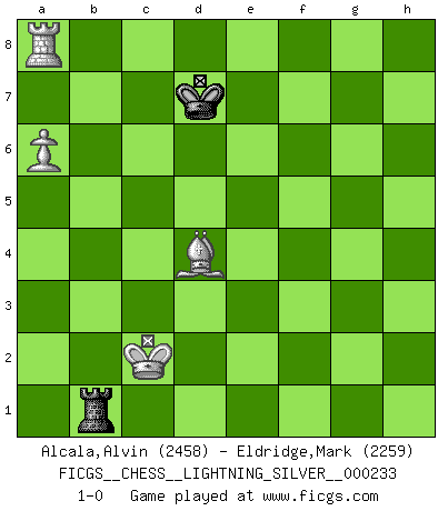 Last move : 1-0 2012 November 4 23:37:0 [Event "FICGS__CHESS__LIGHTNING_SILVER__000233"] [Site "FICGS"] [Date "2012.11.04"] [Round "1"] [White "Alcala,Alvin"] [Black "Eldridge,Mark"] [Result "1-0"] [WhiteElo "2458"] [BlackElo "2259"] 1.c4 e5 2.g3 Nf6 3.Bg2 Nc6 4.Nc3 Bc5 5.e3 O-O 6.Nge2 d6 7.d3 Bf5 8.a3 a5 9.h3 h5 10.e4 Bg6 11.f4 h4 12.f5 Nh5 13.g4 Ng3 14.Nxg3 hxg3 15.h4 Bf2+ 16.Kf1 Nd4 17.Ne2 Bh7 18.h5 Rb8 19.g5 b5 20.Nxd4 Bxd4 21.cxb5 Rxb5 22.Qg4 Qe8 23.g6 fxg6 24.hxg6 Bxg6 25.Bf3 Qf7 26.Qxg3 Bxf5 27.exf5 Qxf5 28.Ke2 d5 29.a4 e4 30.Bg4 Qf2+ 31.Qxf2 Rxf2+ 32.Kd1 Rb6 33.dxe4 dxe4 34.Be2 g5 35.Ra3 Kf8 36.Rg3 Bxb2 37.Be3 Rd6+ 38.Ke1 Rf5 39.Bh5 Bf6 40.Ke2 Rc6 41.Bg6 Re5 42.Rh7 Rc2+ 43.Ke1 Re7 44.Rxe7 Kxe7 45.Rg4 Kd6 46.Rxe4 Bc3+ 47.Kd1 Rg2 48.Rc4 Bb4 49.Be4 Ra2 50.Bc2 c5 51.Bxg5 Ra3 52.Rh4 Ke5 53.Bf4+ Kf6 54.Rh6+ Kf7 55.Kc1 Rf3 56.Bc7 Ra3 57.Ra6 Bc3 58.Bxa5 Ra1+ 59.Bb1 Be5 60.Bd8 Bd4 61.Bg5 Ke8 62.Ra7 Kf8 63.Kc2 c4 64.Ra6 Kf7 65.Bh4 Kf8 66.a5 c3 67.Ra8+ Kf7 68.a6 Ra3 69.Be1 Ke7 70.Kd3 c2 71.Kxc2 Kd7 72.Bb4 Ra1 73.Bc3 Rxb1 74.Bxd4 1-0 English Opening Kingside Castling by player Black (move 5) 10 pieces endgame at move 51 : White KRBBP , Black KRBPP WHITE : King + 1 Rook 2 Bishops 1 Pawn BLACK : King + 1 Rook 1 Bishop 2 Pawns 9 pieces endgame at move 58 : White KRBBP , Black KRBP WHITE : King + 1 Rook 2 Bishops 1 Pawn BLACK : King + 1 Rook 1 Bishop 1 Pawn 8 pieces endgame at move 71 : White KRBBP , Black KRB WHITE : King + 1 Rook 2 Bishops 1 Pawn BLACK : King + 1 Rook 1 Bishop 7 pieces endgame at move 73 : White KRBP , Black KRB WHITE : King + 1 Rook 1 Bishop 1 Pawn BLACK : King + 1 Rook 1 Bishop 6 pieces endgame at move 74 : White KRBP , Black KR WHITE : King + 1 Rook 1 Bishop 1 Pawn BLACK : King + 1 Rook Player White won this chess game. Follow this game move after move (download)Chess is a part of culture and if a culture is declining then Chess too will decline. (Mikhail Botvinnik) Frage des Reporters: -Worin besteht das Ziel von Gambiteröffnungen? Antwort: -Auf Kosten der Partie einen Ruf als Angriffspieler zu erwerben.- (Siegbert Tarrasch) Prefiero perder una partida realmente buena, que ganar una mala. (David Levy) La guerre est enfant de la passion, la passion est enfant du narcissisme et le narcissisme est l'enfant. (...) Une autre partie ? (Thibault de Vassal) When the going gets tactical, the computers get going. (Hyatt)