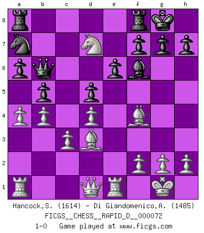 Last move : 1-0 2012 December 11 19:19:15 [Event "FICGS__CHESS__RAPID_D__000072"] [Site "FICGS"] [Date "2012.11.06"] [Round "1"] [White "Hancock,Sarah"] [Black "Di Giandomenico,Alfonso"] [Result "1-0"] [WhiteElo "1614"] [BlackElo "1485"] 1.d4 Nf6 2.Bf4 e6 3.e3 c5 4.Nc3 a6 5.Nf3 cxd4 6.exd4 d6 7.Bd3 Be7 8.O-O Nc6 9.Ne4 d5 10.Nxf6+ Bxf6 11.c3 b5 12.b4 Bd7 13.a4 Na7 14.Ne5 O-O 15.Re1 Qb6 16.Nxd7 1-0 Queen's pawn game Kingside Castling by player White (move 8) Kingside Castling by player Black (move 14) Player White won this chess game. Follow this game move after move (download)Chess is as much a mystery as women. (Purdy) Wie ich sie so einen nach dem anderen nieder mähte wurde meine Überlegenheit offensichtlich. (José Raúl Capablanca) El Ajedrez es la vida. (Bobby Fischer) En blitz, le Cavalier l'emporte sur le Fou. (Vlastimil Hort) CHESS, n. f. [echecs, Fr.] A nice and abstruse game, in which two sets of puppets are moved in opposition to each other. (Dr Samuel Johnson, A Dictionary Of The English Language, 1755)