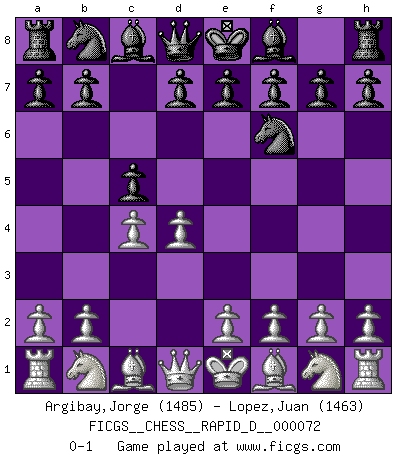 Last move : 0-1 2012 December 28 11:13:46 [Event "FICGS__CHESS__RAPID_D__000072"] [Site "FICGS"] [Date "2012.11.06"] [Round "1"] [White "Argibay,Jorge"] [Black "Lopez,Juan"] [Result "0-1"] [WhiteElo "1485"] [BlackElo "1463"] 1.d4 Nf6 2.c4 c5 0-1 This chess game has been lost on time (started : 2012.11.06 18:46:39) Benoni defense Player Black won this chess game. Follow this game move after move (download)White lost because he failed to remember the right continuation and had to think up the moves himself. (Siegbert Tarrasch) Kann Schach nicht schließlich das Nationalspiel der Deutschen werden? Und welche weiteren Ausblicke bieten sich dann dar! Welche Hebung des allgemeinen Kultur-Niveaus, ja der Moral, wenn das Schachbrett den Kartentisch verdrängen würde! Wahrlich, ein Ziel, des Schweißes der Edlen wert! (Siegbert Tarrasch) Antes de los Finales, los dioses han colocado el Juego Medio. (Siegbert Tarrasch) Vous m'avez demandé de vous exposer quel est le fondement de la prière. Je ne fais que préparer les pièces du jeu sur la table... Nous sera-t-il permis d'en adopter les règles et si nous les appliquons scrupuleusement nous ne tarderons pas à faire mat le Roi divin ! Il ne pourra échapper à nos mains. (Sainte Thérèse d'Avila, Chemin de perfection) I fear not the man who has practiced 10,000 kicks once, but I fear the man who has practiced one kick 10,000 times. (Bruce Lee)