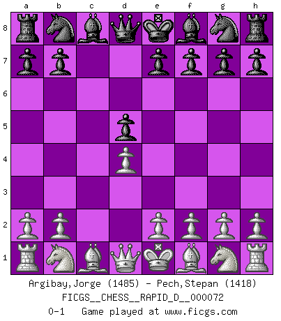 Last move : 0-1 2013 January 13 0:15:35 [Event "FICGS__CHESS__RAPID_D__000072"] [Site "FICGS"] [Date "2012.11.06"] [Round "1"] [White "Argibay,Jorge"] [Black "Pech,Stepan"] [Result "0-1"] [WhiteElo "1485"] [BlackElo "1418"] 1.d4 d5 2.c4 c6 3.cxd5 cxd5 0-1 This chess game has been lost on time (started : 2012.11.06 18:46:39) QGD Slav defense : Exchange variation Player Black won this chess game. Follow this game move after move (download)Methodical thinking is of more use in Chess than inspiration. (C. J. S. Purdy) Die Fehler sind da, Sie warten nur darauf gemacht zu werden. (Savielly Grigorievitsch Tartakower) Hay dos clases de hombres: aquellos que se conforman en dejarse llevar por las circunstancias y que juegan barajas y aquellos decididos a controlar las circunstancias y que juegan al Ajedrez. (Mortimer Collins) Un journaliste : 'Vous préférez avoir une dame de plus sur l'échiquier ou au lit ?' Boris Spassky : 'Ca dépend de la position.' If things go wrong, don't go with them. (Roger Babson)