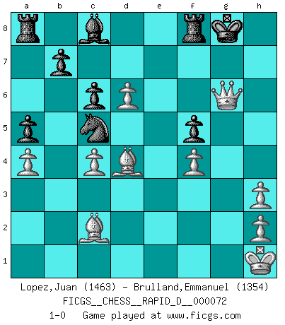 Last move : 1-0 2012 December 28 1:27:2 [Event "FICGS__CHESS__RAPID_D__000072"] [Site "FICGS"] [Date "2012.11.06"] [Round "1"] [White "Lopez,Juan"] [Black "Brulland,Emmanuel"] [Result "1-0"] [WhiteElo "1463"] [BlackElo "1354"] 1.d4 d5 2.c4 c6 3.e3 e6 4.Nc3 Nf6 5.a3 Be7 6.Nf3 O-O 7.Bd3 Nbd7 8.b3 Re8 9.Bb2 dxc4 10.bxc4 Nb6 11.O-O Bf8 12.Qc2 h6 13.e4 g6 14.e5 Nfd7 15.Ne4 Bg7 16.Nd6 Rf8 17.a4 a5 18.Nd2 Qe7 19.N2e4 Rd8 20.f4 Bf8 21.Kh1 Qh4 22.Rf3 Qe7 23.Qf2 f5 24.Nc5 Nxc5 25.dxc5 Nd7 26.Rg3 Kg7 27.Bd4 Kh7 28.Rh3 Qg7 29.Ra3 Bxd6 30.exd6 Qf8 31.Bc2 Re8 32.Rxh6+ Qxh6 33.Rh3 Qxh3 34.gxh3 Kg8 35.Qh4 Rf8 36.Qe7 Rf7 37.Qxe6 Nxc5 38.Qe8+ Rf8 39.Qxg6+ 1-0 QGD Slav defense Kingside Castling by player Black (move 6) Kingside Castling by player White (move 11) Player White won this chess game. Follow this game move after move (download)A big shock; the best chess player in history has passed away. (Lajos Portisch, about Bobby Fischer's death) In Buenos Aires ist es nicht mein vorrangiges Ziel ein starkes Turnier zu organisieren, sondern ein Turnier für Gentlemen. Ich würde nie Kamsky einladen. Ich mag keine Probleme. (Miguel Najdorf) La maestría del Ajedrez consiste esencialmente en analizar posiciónes de Ajedrez con precisión. (Mikhail Botvinnik) Toutes les manuvres exécutées sur une colonne ouverte ont pour but ultime l'intrusion définitive sur la septième ou la huitième rangée, en plein cur de la position ennemie. (Aaron Nimzovitch) If you ain't just a little scared when you enter a casino, you are either very rich or you haven't studied the games enough. (Pappy)