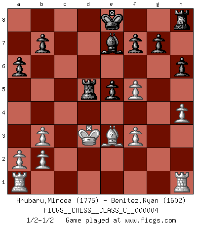 Last move : 1/2-1/2 2006 May 27 11:53:42 [Event "FICGS__CHESS__CLASS_C__000004"] [Site "FICGS"] [Date "2006.05.16"] [Round "1"] [White "Hrubaru,Mircea"] [Black "Benitez,Ryan"] [Result "1/2-1/2"] [WhiteElo "1775"] [BlackElo "1602"] 1.e4 c5 2.Nf3 d6 3.d4 cxd4 4.Nxd4 Nf6 5.Nc3 a6 6.Bc4 e6 7.Bb3 Be7 8.g4 h6 9.Be3 Nbd7 10.h4 Qa5 11.f3 Nc5 12.Qd2 e5 13.Nf5 Nxb3 14.cxb3 Bxf5 15.gxf5 d5 16.Nxd5 Qxd2+ 17.Kxd2 Nxd5 18.exd5 Rd8 19.Kd3 Rxd5+ 1/2-1/2 Sicilian : Najdorf, Lipnitzky attack This chess game ended in a draw. Follow this game move after move (download)I'd rather have a Pawn than a finger. (Reuben Fine) Man kann eine Schachpartie nur gewinnen, wenn das Gleichgewicht gestört ist. In einer Stellung mit ungestörtem Gleichgewicht ist auch das größte Genie hilflos - in der Stellung steckt dann eben kein genialer Einfall. (Wilhelm Steinitz) La batalla por la última verdad nunca sera ganada. Y es por eso que el Ajedrez es tan fascinante. (Hans Kmoch) La vie est comme un jeu d'échecs : nous esquissons un plan, mais celui-ci est tributaire de ce que daignent faire l'adversaire aux échecs et le destin dans la vie. (Arthur Schopenhauer) Players are not good because they find tactics, it is about the way to find the positions in which those tactics are hidden. (Luc-Olivier Leclerc)