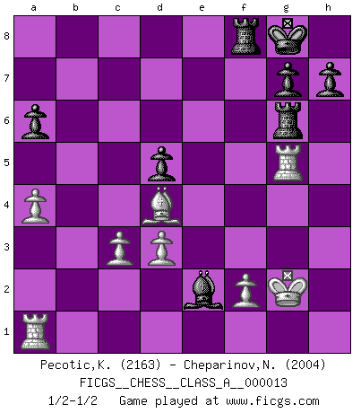 Last move : 1/2-1/2 2007 February 5 17:9:59 [Event "FICGS__CHESS__CLASS_A__000013"] [Site "FICGS"] [Date "2007.01.18"] [Round "1"] [White "Pecotic,Kuzma"] [Black "Cheparinov,Nedelcho"] [Result "1/2-1/2"] [WhiteElo "2163"] [BlackElo "2004"] 1.e4 e5 2.Nf3 Nc6 3.Bb5 a6 4.Ba4 Nf6 5.O-O Be7 6.Re1 b5 7.Bb3 O-O 8.c3 d5 9.exd5 Nxd5 10.Nxe5 Nxe5 11.Rxe5 c6 12.Re1 Bd6 13.d3 Bf5 14.Qf3 Qh4 15.g3 Qh3 16.Nd2 Rae8 17.Ne4 Bg4 18.Qg2 Qxg2+ 19.Kxg2 f5 20.h3 Bh5 21.g4 fxg4 22.hxg4 Bxg4 23.a4 b4 24.Bd2 bxc3 25.Nxd6 Rd8 26.bxc3 Rxd6 27.Re5 Rg6 28.Rg5 Rgf6 29.Bxd5+ cxd5 30.Be3 Be2 31.Bd4 Rg6 1/2-1/2 Ruy Lopez : Closed, 7...O-O Kingside Castling by player White (move 5) Kingside Castling by player Black (move 7) This chess game ended in a draw. Follow this game move after move (download)I believe that Chess possesses a magic that is also a help in advanced age. A rheumatic knee is forgotten during a game of Chess and other events can seem quite unimportant in comparison with a catastrophe on the chessboard. (Vlastimil Hort) Vielleicht wirkt die Aura früherer Spieler glanzvoller als die der heutigen Spieler, aber das liegt daran, dass man kein Programm wie Fritz hatte, das einem all die Löcher in ihren Partien zeigt. (Vladimir Kramnik) Las leyes del Ajedrez no permiten una libre elección: tienes que mover quieras o no. (Emanuel Lasker) Vouloir jouer aux échecs contre soi-même est aussi paradoxal que vouloir marcher sur son ombre. (Stefan Zweig) Think like a man of action, act like a man of thought. (Henri Louis Bergson)