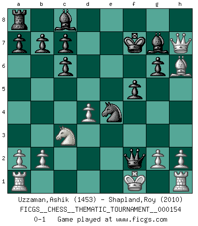 Last move : 0-1 2012 November 15 15:57:40 [Event "FICGS__CHESS__THEMATIC_TOURNAMENT__000154"] [Site "FICGS"] [Date "2012.11.07"] [Round "1"] [White "Uzzaman,Ashik"] [Black "Shapland,Roy"] [Result "0-1"] [WhiteElo "1453"] [BlackElo "2010"] 1.e4 e5 2.Nf3 Nc6 3.Bb5 f5 4.Bxc6 dxc6 5.Nxe5 Qd4 6.Qh5+ g6 7.Nxg6 Nf6 8.Qh4 hxg6 9.Qxh8 Qxe4+ 10.Kf1 Qxc2 11.Nc3 Kf7 12.d4 Ne4 13.Qh7+ Bg7 14.Bh6 Qxf2+ 0-1 Ruy Lopez : Schliemann defense Player Black won this chess game. Follow this game move after move (download)Chess books should be used as we use glasses: to assist the sight, although some players make use of them as if they thought they conferred sight. (Jose Raul Capablanca) Wenn ich gewinne bin ich ein Genie. Wenn nicht, dann bin ich keines. (Robert James Fischer) ¿Se han dado cuenta de que Fischer casi nunca ha tenido piezas malas? El las intercambia y las piezas malas se quedan con sus oponenets. (Yuri Balashov) La vérité est comme le meilleur coup aux échecs : elle existe, mais il faut la chercher. (Arturo Perez-Reverte) Opportunities multiply as they are seized. (Sun Tzu)