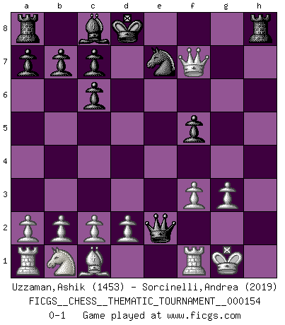 Last move : 0-1 2012 November 13 2:38:27 [Event "FICGS__CHESS__THEMATIC_TOURNAMENT__000154"] [Site "FICGS"] [Date "2012.11.07"] [Round "1"] [White "Uzzaman,Ashik"] [Black "Sorcinelli,Andrea"] [Result "0-1"] [WhiteElo "1453"] [BlackElo "2019"] 1.e4 e5 2.Nf3 Nc6 3.Bb5 f5 4.Bxc6 dxc6 5.Nxe5 Qd4 6.Qh5+ g6 7.Nxg6 hxg6 8.Qxg6+ Kd8 9.O-O Bd6 10.g3 Ne7 11.Qf7 Bxg3 12.hxg3 Qxe4 13.f3 Qe2 0-1 Ruy Lopez : Schliemann defense Kingside Castling by player White (move 9) Player Black won this chess game. Follow this game move after move (download)The chessboard is the world, the pieces are the phenomena of the Universe, the rules of the game are what we call the laws of Nature and the player on the other side is hidden from us. (Thomas Huxley) Es macht mich traurig, wenn ich sehe, dass Golfprofis mehr verdienen als Schachsportler. Obwohl ich davon überzeugt bin, dass wir Schachspieler viel härter trainieren müssen als die Golfer. (Alexandra Kosteniuk) Un mal día en el Ajedrez, es mejor que cualquier buen día en el trabajo. (Anonymous) Le joueur d'Echecs qui veut atteindre le top est obligé de développer son propre credo créatif. Alexeï Stepanovicth Souétine. Il est facile d'écrire des livres ! Ce qui est difficile, c'est de jouer ! (Alexeï Stepanovicth Souétine) Indecision is the key to flexibility. (Unknown)
