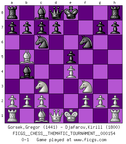 Last move : 0-1 2012 December 29 23:17:51 [Event "FICGS__CHESS__THEMATIC_TOURNAMENT__000154"] [Site "FICGS"] [Date "2012.11.07"] [Round "1"] [White "Gorsek,Gregor"] [Black "Djafarov,Kirill"] [Result "0-1"] [WhiteElo "1441"] [BlackElo "1800"] 1.e4 e5 2.Nf3 Nc6 3.Bb5 f5 4.d3 fxe4 5.dxe4 Nf6 6.Nc3 Bb4 0-1 This chess game has been lost on time (started : 2012.11.07 22:24:26) Ruy Lopez : Schliemann defense Player Black won this chess game. Follow this game move after move (download)Personally, I rather look forward to a computer program winning the world Chess Championship. Humanity needs a lesson in humility. (Richard Dawkings) Fallen sollten polizeilich verboten werden. (Savielly Grigorievitsch Tartakower) Las Aperturas te enseñan aperturas. ¡Los Finales te enseñan Ajedrez!. (Stephan Gerzadowicz) Celui qui prend des risques peut perdre, celui qui n'en prend pas perd toujours. (Xavier Tartacover) When you stop learning you start dying. (M. Scott Adams)
