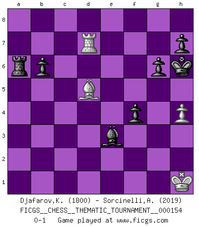 Last move : 0-1 2013 June 24 20:8:56 [Event "FICGS__CHESS__THEMATIC_TOURNAMENT__000154"] [Site "FICGS"] [Date "2012.11.07"] [Round "1"] [White "Djafarov,Kirill"] [Black "Sorcinelli,Andrea"] [Result "0-1"] [WhiteElo "1800"] [BlackElo "2019"] 1.e4 e5 2.Nf3 Nc6 3.Bb5 f5 4.d3 fxe4 5.dxe4 Nf6 6.O-O d6 7.Nc3 Be7 8.Qd3 O-O 9.Bc4+ Kh8 10.Ng5 Qe8 11.Ne6 Bxe6 12.Bxe6 Nd4 13.Bc4 Qg6 14.Be3 Nf3+ 15.Kh1 Nxh2 16.Kxh2 Ng4+ 17.Kg1 Qh5 18.Bf4 exf4 19.Qh3 Qxh3 20.gxh3 Ne5 21.Bb3 c6 22.f3 Bd8 23.Kh2 Bb6 24.Ne2 a5 25.a4 Rae8 26.Rad1 d5 27.exd5 Nxf3+ 28.Rxf3 Rxe2+ 29.Kh1 Be3 30.h4 cxd5 31.Rxd5 g6 32.Rxa5 Rd8 33.Rd5 Rxd5 34.Bxd5 Rxc2 35.b4 b6 36.Rf1 Rb2 37.a5 Rxb4 38.a6 Ra4 39.Bb7 Ra2 40.Rd1 Kg7 41.Rd7+ Kh6 42.Bd5 Rxa6 0-1 Ruy Lopez : Schliemann defense Kingside Castling by player White (move 6) Kingside Castling by player Black (move 8) Player Black won this chess game. Follow this game move after move (download)He who fears an isolated Queen's Pawn should give up Chess. (Siegbert Tarrasch) Als er Schachweltmeister wurde ließ er praktisch alle stärksten Sovietspieler für sich arbeiten. Wenn ein auch nur mittelmässiger Meister ein Spezialist für eine bestimmte Eröffnung war, wurde er von Karpov gerufen. Das wurde alles geheim gehalten. (Mikhail Moiseyevich Botvinik) El Ajedrez es un cuento de Hadas de las 1001 metidas de pata. (Savielly Tartakower) Il s'avisa de me proposer d'apprendre les échecs qu'il jouait un peu... me voilà forcené des échecs. J'achète un échiquier, je m'enferme dans ma chambre, j'y passe des jours et des nuits à vouloir apprendre par cur toutes les parties. (Jean-Jacques Rousseau, Confessions) Dave, my mind is going. I can feel it. (HAL 9000 in 2001, a space odyssey)
