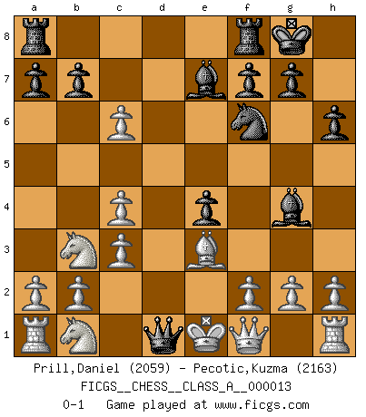 Last move : 0-1 2007 February 6 21:40:59 [Event "FICGS__CHESS__CLASS_A__000013"] [Site "FICGS"] [Date "2007.01.18"] [Round "1"] [White "Prill,Daniel"] [Black "Pecotic,Kuzma"] [Result "0-1"] [WhiteElo "2059"] [BlackElo "2163"] 1.e4 e5 2.Nf3 Nc6 3.Bc4 Nf6 4.Ng5 d5 5.exd5 Na5 6.d3 h6 7.Nf3 e4 8.Qe2 Nxc4 9.dxc4 Bc5 10.Nfd2 O-O 11.Nb3 Bg4 12.Qf1 Bb4+ 13.c3 Be7 14.Be3 c6 15.dxc6 Qd1+ 0-1 Two knights defense : Kieseritsky variation Kingside Castling by player Black (move 10) Player Black won this chess game. Follow this game move after move (download)In Chess, at least, the brave inherit the earth. (Edmar Mednis) Ein unbeabsichtigtes Patt ist der Gipfel der Dummheit. (Anonymous) El poder defensivo de una pieza clavada, solamente es imaginario. (Aaron Nimzovich) Les Echecs ne sont pas pour les âmes timides. Ils requièrent un homme entier, qui ne s'arrête pas aveuglément à ce qui a été déjà établi, mais qui tente individuellement de sonder les profondeurs du jeu. (W. Steinitz) When the going gets tactical, the computers get going. (Hyatt)