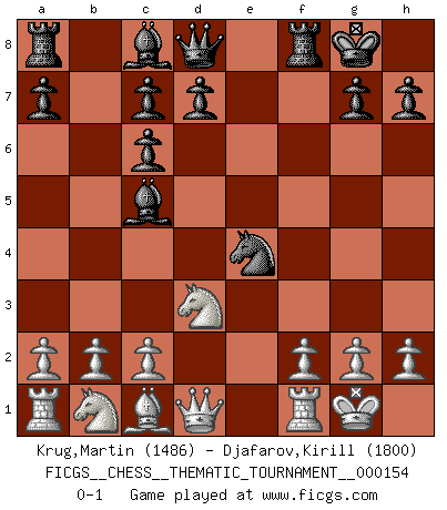 Last move : 0-1 2012 December 31 11:19:0 [Event "FICGS__CHESS__THEMATIC_TOURNAMENT__000154"] [Site "FICGS"] [Date "2012.11.07"] [Round "1"] [White "Krug,Martin"] [Black "Djafarov,Kirill"] [Result "0-1"] [WhiteElo "1486"] [BlackElo "1800"] 1.e4 e5 2.Nf3 Nc6 3.Bb5 f5 4.d3 fxe4 5.dxe4 Nf6 6.O-O Bc5 7.Bxc6 bxc6 8.Nxe5 O-O 9.Nd3 Nxe4 0-1 This chess game has been lost on time (started : 2012.11.07 22:24:26) Ruy Lopez : Schliemann defense Kingside Castling by player White (move 6) Kingside Castling by player Black (move 8) Player Black won this chess game. Follow this game move after move (download)Chess is mental torture. (Garry Kasparov) Pläne sind die Träume des Verständigen. (Ernst Freiherr von Feuchtersleben) El estómago es una parte esencial del maestro de Ajedrez. (Bent Larsen) Les échecs c'est le défi de l'alpiniste, toujours plus haut, prêt à tout pour monter à l'assaut du Roi ennemi. Les échecs, c'est de la musique en mouvement, un ballet majestueux pour les yeux. C'est de la poésie composée par les fantômes du passé qui au même titre que Rimbaud ou Verlaine méritent notre admiration. Les échecs, c'est de la peinture ou le moindre mouvement modifie le tableau pour en faire un Picasso ou un Van Gogh. Les échecs, c'est tout et rien, c'est la vie et la mort. Jjulie33 sur le forum de France-Echecs. The bottom line is always the bottom line. (Johann Piek)