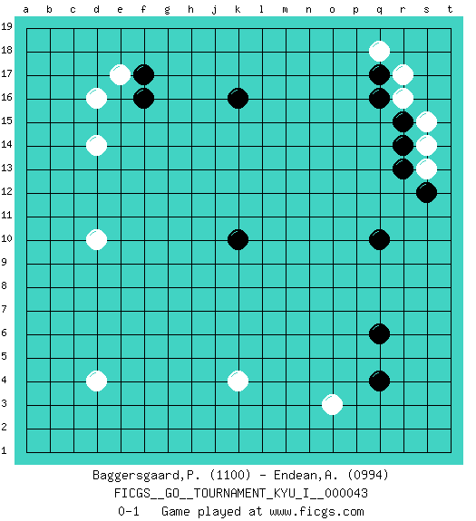 Last move : 0-1 2013 January 2 11:27:57 [Event "FICGS__GO__TOURNAMENT_KYU_I__000043"] [Site "FICGS"] [Date "2012.11.10"] [Round "1"] [Black "Baggersgaard,Poulerik"] [White "Endean,Andrew"] [Result "0-1"] [Rating 1 "1100"] [Rating 2 "0994"] 1.q16 d16 2.q4 d4 3.q10 d10 4.f17 e17 5.f16 d14 6.k16 k4 7.k10 o3 8.q6 r17 9.q17 r16 10.r15 s15 11.r14 s14 12.r13 s13 13.s12 q18 0-1 This go game has been lost on time (started : 2012.11.10 9:34:13) Here are the names of the openings (joseki) played in the four corners : Corner d16 : d16 f17 Hoshi (Hwajeom, Seongjeom, Xingwei`) 4-4 Point. The star or hoshi (4-4) point, emphasizing influence at the potential expense of territory. Ikken Kakari (Hankan Keolch'im, Yi Gua`jiao~, 1-Space Low Approach). Black 2 is the standard approach move to the 4-4. Corner q4 : q4 o3 Hoshi (Hwajeom, Seongjeom, Xingwei`) 4-4 Point. The star or hoshi (4-4) point, emphasizing influence at the potential expense of territory. Ikken Kakari (Hankan Keolch'im, Yi Gua`jiao~, 1-Space Low Approach). White 2 is the standard approach move to the 4-4. Corner q16 : q16 r17 Hoshi (Hwajeom, Seongjeom, Xingwei`) 4-4 Point. The star or hoshi (4-4) point, emphasizing influence at the potential expense of territory. Player White won this Go (weiqi, baduk) game. Follow this game move after move (download)Five liberties for tactical stability. (Anonymous) Warrior pose battles inner weakness and wins focus. You see that there is no war within you. You're on your own side, and you are your own strength. (Terri Guillemets)