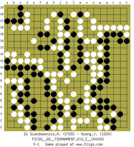 Last move : 0-1 2013 August 16 21:8:37 [Event "FICGS__GO__TOURNAMENT_KYU_I__000043"] [Site "FICGS"] [Date "2012.11.10"] [Round "1"] [Black "Di Giandomenico,Alfonso"] [White "Huang,Jing"] [Result "0-1"] [Rating 1 "0728"] [Rating 2 "1334"] 1.d4 q16 2.q4 c16 3.d10 k3 4.j3 k4 5.j4 j5 6.h4 l6 7.q10 o3 8.q5 j16 9.q15 p16 10.r15 r16 11.s15 d12 12.c10 c3 13.d3 c4 14.c5 b5 15.c6 b6 16.b7 d2 17.e2 c2 18.e1 d5 19.e5 c7 20.d6 b8 21.d7 c8 22.d8 o14 23.q13 o10 24.q8 p12 25.q12 f11 26.g6 g9 27.k2 l2 28.k1 h7 29.h6 j6 30.h5 o8 31.p3 r3 32.r4 p2 33.g8 h8 34.g7 h9 35.k17 j17 36.k16 k15 37.l15 m17 38.n17 m16 39.n16 m15 40.j18 g17 41.m18 l18 42.n15 n18 43.o15 p15 44.k14 j15 45.m14 n14 46.q14 o17 47.l3 m2 48.l4 k5 49.m5 o5 50.o4 n4 51.p4 n2 52.q2 q1 53.r2 n5 54.s3 b12 55.o6 n6 56.o7 n7 57.p8 o9 58.m13 n12 59.m12 n11 60.m11 k12 61.j12 k11 62.j11 k10 63.j10 j9 64.r1 p1 65.p11 o12 66.p14 s16 67.f9 f10 68.e9 d11 69.e10 e11 70.p7 t15 71.t14 t16 72.s14 b11 73.b10 p9 74.q9 c11 75.a11 a12 76.a10 a8 77.k13 h13 78.n10 o16 79.k9 l9 80.c17 d17 81.c18 b16 82.b17 d18 83.c19 d16 84.a17 l1 85.p5 j2 86.h2 h1 87.j1 j2 88.g1 j1 89.g3 d1 90.e3 p10 91.q11 o11 92.l10 k8 93.b4 b3 94.c9 p13 95.h14 j14 96.g13 j13 97.f13 h18 98.g15 g16 99.f15 e14 0-1 Here are the names of the openings (joseki) played in the four corners : Corner q4 : q4 l6 Hoshi (Hwajeom, Seongjeom, Xingwei`) 4-4 Point. The star or hoshi (4-4) point, emphasizing influence at the potential expense of territory. Corner q16 : q16 q15 Hoshi (Hwajeom, Seongjeom, Xingwei`) 4-4 Point. The star or hoshi (4-4) point, emphasizing influence at the potential expense of territory. Player White won this Go (weiqi, baduk) game. Follow this game move after move (download)To emphasize the lack of determination in his moves, one speaks of chance. (Pierre Audouard) Creativity is allowing yourself to make mistakes. Art is knowing which ones to keep. (Scott Adams)