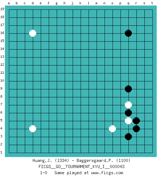 Last move : 1-0 2013 January 4 11:33:5 [Event "FICGS__GO__TOURNAMENT_KYU_I__000043"] [Site "FICGS"] [Date "2012.11.10"] [Round "1"] [Black "Huang,Jing"] [White "Baggersgaard,Poulerik"] [Result "1-0"] [Rating 1 "1334"] [Rating 2 "1100"] 1.q16 d4 2.q3 d16 3.q9 q5 4.r4 o4 5.r5 q7 6.q6 1-0 This go game has been lost on time (started : 2012.11.10 9:34:13) Here are the names of the openings (joseki) played in the four corners : Player Black won this Go (weiqi, baduk) game. Follow this game move after move (download)There are players who don't accept exchange: they play many moves that perpetuate a previous state of the game. (Pierre Audouard) A person who never made a mistake never tried anything new. (Albert Einstein)