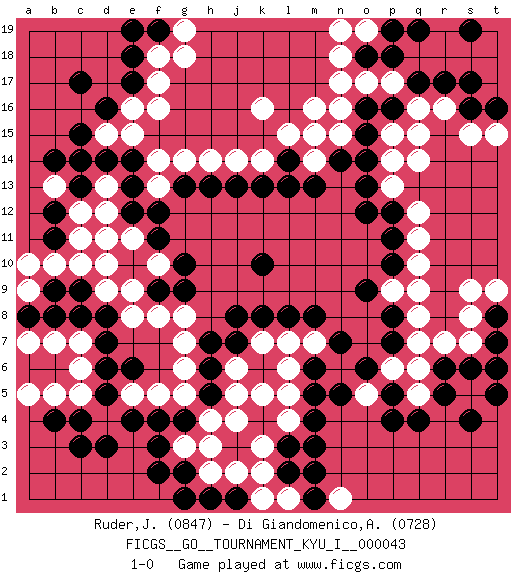 Last move : 1-0 2013 September 3 13:25:2 [Event "FICGS__GO__TOURNAMENT_KYU_I__000043"] [Site "FICGS"] [Date "2012.11.10"] [Round "1"] [Black "Ruder,John"] [White "Di Giandomenico,Alfonso"] [Result "1-0"] [Rating 1 "0847"] [Rating 2 "0728"] 1.d16 q16 2.q4 d4 3.k10 k16 4.f3 d10 5.d6 q10 6.c3 q5 7.r5 q6 8.r6 r7 9.p4 s7 10.s4 e16 11.e17 f16 12.c17 f17 13.e18 f18 14.c13 d15 15.c15 c12 16.d14 e15 17.c4 q14 18.c9 c10 19.b9 b10 20.b12 m16 21.e12 e11 22.f12 d12 23.g10 d9 24.d8 e8 25.d7 f10 26.f9 e9 27.f11 d11 28.b11 f8 29.g9 g7 30.j7 j4 31.h5 h4 32.g4 g5 33.h6 g3 34.f4 h3 35.l3 k5 36.m5 l6 37.n7 l4 38.m3 k3 39.m4 l5 40.l8 j5 41.r17 r16 42.q17 p17 43.p18 o17 44.o18 n18 45.s16 s15 46.s17 t15 47.p11 q11 48.p12 q12 49.l14 j14 50.j13 h14 51.h13 g14 52.o9 p9 53.p8 q8 54.p10 q9 55.p7 q7 56.g2 h2 57.f2 j2 58.o15 n16 59.n14 d13 60.e14 f14 61.e13 k2 62.l2 m7 63.m8 k7 64.j8 j6 65.h7 g6 66.k8 e5 67.e6 f5 68.d3 l7 69.o6 a9 70.b8 b13 71.c14 b7 72.a8 a10 73.b14 a7 74.c8 m14 75.m13 m15 76.f19 g19 77.e19 g18 78.q19 o19 79.s19 k14 80.k13 l15 81.l13 p13 82.o13 p14 83.o14 p15 84.o16 n17 85.p16 q15 86.s6 t6 87.t5 c5 88.d5 b5 89.e4 c6 90.b4 a5 91.g13 n6 92.m6 o5 93.p5 g8 94.t7 s9 95.t8 t9 96.t16 l1 97.m1 k1 98.h1 n1 99.m2 s8 100.t6 p6 101.n5 n15 102.o12 f13 103.p19 n19 104.g1 c7 105.j1 c11 106.pass 1-0 Here are the names of the openings (joseki) played in the four corners : Corner d4 : d4 f3 Hoshi (Hwajeom, Seongjeom, Xingwei`) 4-4 Point. The star or hoshi (4-4) point, emphasizing influence at the potential expense of territory. Ikken Kakari (Hankan Keolch'im, Yi Gua`jiao~, 1-Space Low Approach). Black 2 is the standard approach move to the 4-4. Corner q4 : q4 q5 Hoshi (Hwajeom, Seongjeom, Xingwei`) 4-4 Point. The star or hoshi (4-4) point, emphasizing influence at the potential expense of territory. Corner d16 : d16 e16 Hoshi (Hwajeom, Seongjeom, Xingwei`) 4-4 Point. The star or hoshi (4-4) point, emphasizing influence at the potential expense of territory. Player Black won this Go (weiqi, baduk) game. Follow this game move after move (download)Don't make a play adjacent to a cutting-point. (Anonymous) Some people are so afraid to die that they never begin to live. (Henry Van Dyke)