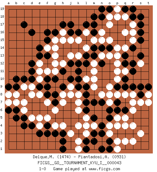 Last move : 1-0 2013 May 27 22:10:40 [Event "FICGS__GO__TOURNAMENT_KYU_I__000043"] [Site "FICGS"] [Date "2012.11.10"] [Round "1"] [Black "Delque,Michael"] [White "Piantadosi,Angelo"] [Result "1-0"] [Rating 1 "1474"] [Rating 2 "0931"] 1.c4 q4 2.d16 q16 3.e3 k4 4.d10 f5 5.q10 r7 6.r14 p14 7.q13 p13 8.q12 p12 9.k16 m15 10.k10 e4 11.d4 d5 12.f4 e5 13.f3 g4 14.g3 h4 15.m3 l3 16.p3 p4 17.q3 o3 18.o2 n2 19.n3 o4 20.m2 p2 21.n1 q2 22.r3 r2 23.m5 m4 24.n4 l4 25.o5 p5 26.p6 r4 27.o6 s3 28.m17 l16 29.l17 k15 30.j16 g14 31.g16 h15 32.f15 f14 33.e14 g15 34.f16 h16 35.h17 j15 36.j17 o17 37.s16 r17 38.s17 p10 39.p9 q11 40.r11 p11 41.r9 q8 42.q9 o9 43.l8 k6 44.m7 m9 45.l9 m10 46.k12 k13 47.l12 m12 48.l13 l14 49.m13 n13 50.n12 m11 51.n14 o13 52.m14 n15 53.c5 c6 54.b6 c7 55.h1 k2 56.l1 k1 57.b9 c9 58.c10 d9 59.e9 e8 60.c8 d8 61.f10 b8 62.f8 f7 63.g8 h7 64.j12 h12 65.k11 j13 66.h11 g12 67.e13 g11 68.g10 e11 69.d11 e12 70.d12 e10 71.b10 r15 72.s15 q14 73.s13 n8 74.c17 h8 75.h9 j9 76.j10 k8 77.l6 l5 78.n7 k7 79.r18 q18 80.s18 r16 81.q19 p19 82.r19 o18 83.m18 n16 84.q6 r6 85.s8 r8 86.s9 s7 87.g7 g6 88.f9 f11 89.f13 g13 90.o14 o15 91.h2 j3 92.k9 j8 93.a9 a8 94.a6 b7 95.l2 o7 96.p7 o8 97.l7 t8 98.t9 t7 99.n19 p1 100.o1 q5 101.n18 l10 102.h3 a7 103.b5 p8 104.o19 s12 105.r12 p18 106.m16 1-0 Here are the names of the openings (joseki) played in the four corners : Corner q16 : q16 r14 Hoshi (Hwajeom, Seongjeom, Xingwei`) 4-4 Point. The star or hoshi (4-4) point, emphasizing influence at the potential expense of territory. Ikken Kakari (Hankan Keolch'im, Yi Gua`jiao~, 1-Space Low Approach). Black 2 is the standard approach move to the 4-4. Player Black won this Go (weiqi, baduk) game. Follow this game move after move (download)Never try to cut bamboo joints. (Anonymous) Good luck. You're gonna need it. (Han Solo in Star Wars ep.6)