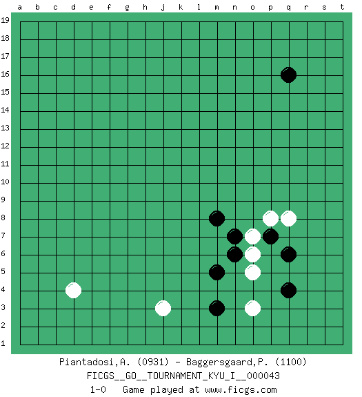 Last move : 1-0 2013 January 2 11:27:57 [Event "FICGS__GO__TOURNAMENT_KYU_I__000043"] [Site "FICGS"] [Date "2012.11.10"] [Round "1"] [Black "Piantadosi,Angelo"] [White "Baggersgaard,Poulerik"] [Result "1-0"] [Rating 1 "0931"] [Rating 2 "1100"] 1.q16 d4 2.q4 o3 3.m3 o5 4.q6 j3 5.m5 o7 6.m8 q8 7.p7 p8 8.n6 o6 9.n7 1-0 This go game has been lost on time (started : 2012.11.10 9:34:13) Here are the names of the openings (joseki) played in the four corners : Corner q4 : q4 o3 Hoshi (Hwajeom, Seongjeom, Xingwei`) 4-4 Point. The star or hoshi (4-4) point, emphasizing influence at the potential expense of territory. Ikken Kakari (Hankan Keolch'im, Yi Gua`jiao~, 1-Space Low Approach). White 2 is the standard approach move to the 4-4. Player Black won this Go (weiqi, baduk) game. Follow this game move after move (download)Strike at the waist of the knight's move. (Anonymous) Convictions are more dangerous enemies of truth than lies. (Friedrich Nietzsche)