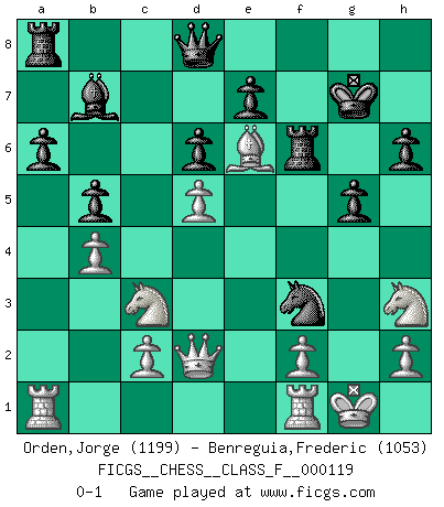 Last move : 0-1 2012 December 20 9:25:10 [Event "FICGS__CHESS__CLASS_F__000119"] [Site "FICGS"] [Date "2012.11.11"] [Round "1"] [White "Orden,Jorge"] [Black "Benreguia,Frederic"] [Result "0-1"] [WhiteElo "1199"] [BlackElo "1053"] 1.e4 d6 2.Nf3 g6 3.d4 Bg7 4.Be2 Nf6 5.Nc3 a6 6.O-O O-O 7.b4 b5 8.Be3 Bb7 9.e5 c6 10.exf6 Bxf6 11.Bh6 Bg7 12.Bxg7 Kxg7 13.Qd2 f5 14.Ng5 Rf6 15.a4 h6 16.Nh3 g5 17.axb5 cxb5 18.d5 Nd7 19.g4 fxg4 20.Bxg4 Ne5 21.Be6 Nf3+ 0-1 King's pawn Opening Kingside Castling by player White (move 6) Kingside Castling by player Black (move 6) Player Black won this chess game. Follow this game move after move (download)With or without the title, Bobby Fischer was unquestionably the greatest player of his time. (Burt Hochberg) Ich verachte die Medien. (Robert James Fischer) Yo adoro todas la posiciones. Denme una partida posicional difícil, y la jugaré. Pero posiciones totalmente ganadas, no las tolero. (Hein Donner) La guerre est enfant de la passion, la passion est enfant du narcissisme et le narcissisme est l'enfant. (...) Une autre partie ? (Thibault de Vassal) Employ the attack like tactic of defense. (Chinese proverb)