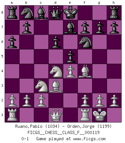 Last move : 0-1 2013 January 5 23:38:48 [Event "FICGS__CHESS__CLASS_F__000119"] [Site "FICGS"] [Date "2012.11.11"] [Round "1"] [White "Ruano,Pablo"] [Black "Orden,Jorge"] [Result "0-1"] [WhiteElo "1034"] [BlackElo "1199"] 1.e4 c5 2.Nf3 d6 3.d4 cxd4 4.Nxd4 Nf6 5.Nc3 a6 6.Bd3 e6 7.O-O Be7 8.Bf4 e5 0-1 This chess game has been lost on time (started : 2012.11.11 14:47:35) Sicilian : Najdorf Kingside Castling by player White (move 7) Player Black won this chess game. Follow this game move after move (download)Good offense and good defense both begin with good development. (Bruce A. Moon) Im Fernschach kannst du während dem Spiel rauchen. (John Christen Knudsen) Bobby solo arroja las piezas y solas caen en las casillas correctas. (Miguel Najdorf ) Les réformistes prétendent que les progrès de la théorie conduiront à la disparition des échecs, et qu'il faut, pour leur rendre vie, en remanier les règles. En réalité, qu'exprime cette affirmation? Le mépris de l'intuition, de l'imagination et de tous les autres éléments qui font des échecs un art. (Alexander Alekhine) Real knowledge is to know the extent of one's ignorance. (Confucius)