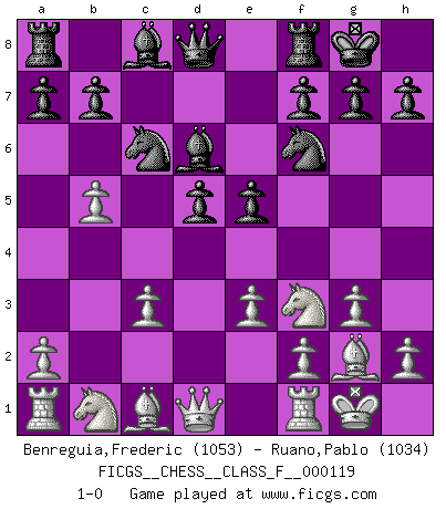 Last move : 1-0 2012 December 29 23:17:51 [Event "FICGS__CHESS__CLASS_F__000119"] [Site "FICGS"] [Date "2012.11.11"] [Round "1"] [White "Benreguia,Frederic"] [Black "Ruano,Pablo"] [Result "1-0"] [WhiteElo "1053"] [BlackElo "1034"] 1.d4 Nf6 2.g3 e6 3.Bg2 d5 4.c3 c5 5.e3 Nc6 6.dxc5 Bxc5 7.Nf3 O-O 8.O-O e5 9.b4 Bd6 10.b5 1-0 This chess game has been lost on time (started : 2012.11.11 14:47:35) Queen's pawn game Kingside Castling by player Black (move 7) Kingside Castling by player White (move 8) Player White won this chess game. Follow this game move after move (download)Chess is a terrific way for kids to build self image and self esteem. (Saudin Robovic) Die Idee von Capablanca, Schach als Fach in den Schulen zu lehren, ist großartig. (Fidel Castro) Haz el enroque temprano y seguido. (Rob Sillars) Le temps de noter son nom sur la feuille de partie, j'étais déjà en zeitnot ! D'un modeste amateur apparié lors de la première ronde d'un open contre le grand-maître Azmaïparashvili. Establishing goals is all right if you don't let them deprive you of interesting detours. (Doug Larson)