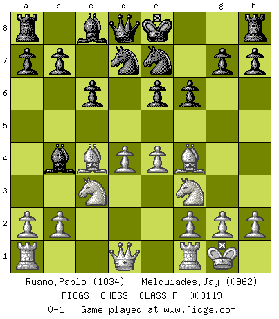 Last move : 0-1 2012 December 29 23:17:51 [Event "FICGS__CHESS__CLASS_F__000119"] [Site "FICGS"] [Date "2012.11.11"] [Round "1"] [White "Ruano,Pablo"] [Black "Melquiades,Jay"] [Result "0-1"] [WhiteElo "1034"] [BlackElo "0962"] 1.d4 d5 2.c4 dxc4 3.Nc3 c6 4.e4 e6 5.Bxc4 Bb4 6.Nf3 f6 7.O-O Ne7 8.Bf4 Nd7 0-1 This chess game has been lost on time (started : 2012.11.11 14:47:35) Queen's gambit accepted Kingside Castling by player White (move 7) Player Black won this chess game. Follow this game move after move (download)In Chess, at least, the brave inherit the earth. (Edmar Mednis) Strategie ist, wie man ein Mädchen auf den Rücksitz bekommt. Taktik ist, was man tut, wenn man dann dort ist. (Anonymous) Una de estas pequeñas movidas modestas pudieran ser mas molestas a tu oponente que la amenaza mas grande. (Siegbert Tarrasch) Les Echecs, c'est l'art de la guerre sans les charniers, c'est la résurrection des morts tombés au champ d'honneur, l'espoir perpétuel, la suprématie de l'intelligence sur la force, la culture de l'esprit. (F. Szpiner) How many people work in NATO Headquarters ? - About half of them. (Dirk Stikker, NATO general secretary)