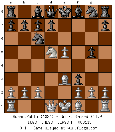 Last move : 0-1 2012 December 30 23:19:54 [Event "FICGS__CHESS__CLASS_F__000119"] [Site "FICGS"] [Date "2012.11.11"] [Round "1"] [White "Ruano,Pablo"] [Black "Gonet,Gerard"] [Result "0-1"] [WhiteElo "1034"] [BlackElo "1179"] 1.e4 e5 2.Nf3 f5 3.Nc3 fxe4 4.d4 exf3 5.dxe5 Qe7 6.Bf4 g5 7.Nd5 Qd8 8.Be3 Nc6 0-1 This chess game has been lost on time (started : 2012.11.11 14:47:35) Latvian counter-gambit Player Black won this chess game. Follow this game move after move (download)When you absolutely don't know what to do anymore, it is time to panic. (John van der Wiel) Später, ... hatte ich zunehmend Erfolg in entscheidenden Partien. Vielleicht weil ich eine einfache Wahrheit erkannte: nicht nur ich hatte Angst, auch mein Gegner. (Mikhail Nekhemyevich Tal) Sin errores no puede haber brillantez. (Emanuel Lasker) Il n'y a plus de joueurs du niveau de Jacob Murray dont la seule quête est le beau jeu, le plaisir de voir les pièces construire quelque chose. Sur 10 idées à la minute, 9 seront sans intérêt, la dernière s'avèrera géniale. (Christian Bauer) Hold em is to stud what chess is to checkers. (Johnny Moss)